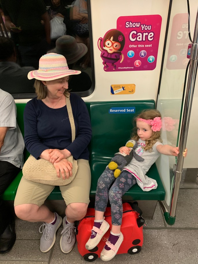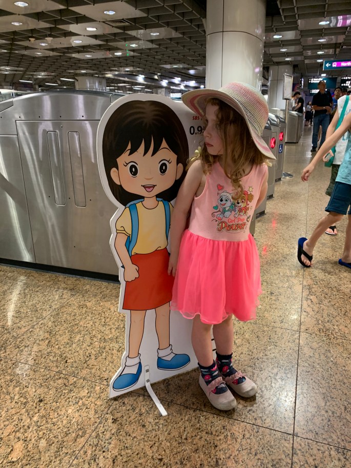 The final stop on our Asian adventure is the exciting city state of Singapore. Immediately on arrival you’re struck by how organized, efficient, clean, and friendly the city is. The MRT (subway) has got to be the best single mode mass transportation system I’ve been on (as an integrated system, I think Paris takes the cake). There are signs in the spotless cars and stations reminding you to make room for those in need. In the stations, not only does the overhead tell you how long till the next train, it displays the passenger loading of each segment of the train. I spotted a travel ad with a picture of the Icefields Parkway in the Changi Airport station! The last figure tells little commuters “If you’re taller than me, you need a child pass to ride”. So cute!