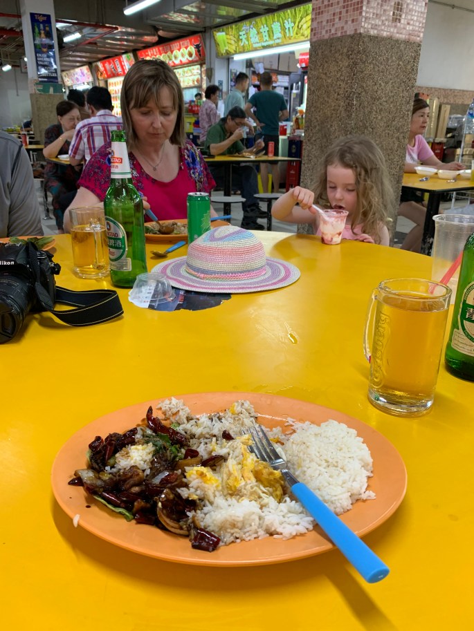In the afternoon we headed into Chinatown for some local fare at a hawker center. It’s a Singapore signature with all sorts of small stalls offering tons of local food and drink. It was really hot in there, hotter than outside, and all we wanted to do we sit down so we basically just stopped at the first place that had an open table nearby. Elinka had an ice cream sundae from McDonald’s across the street.