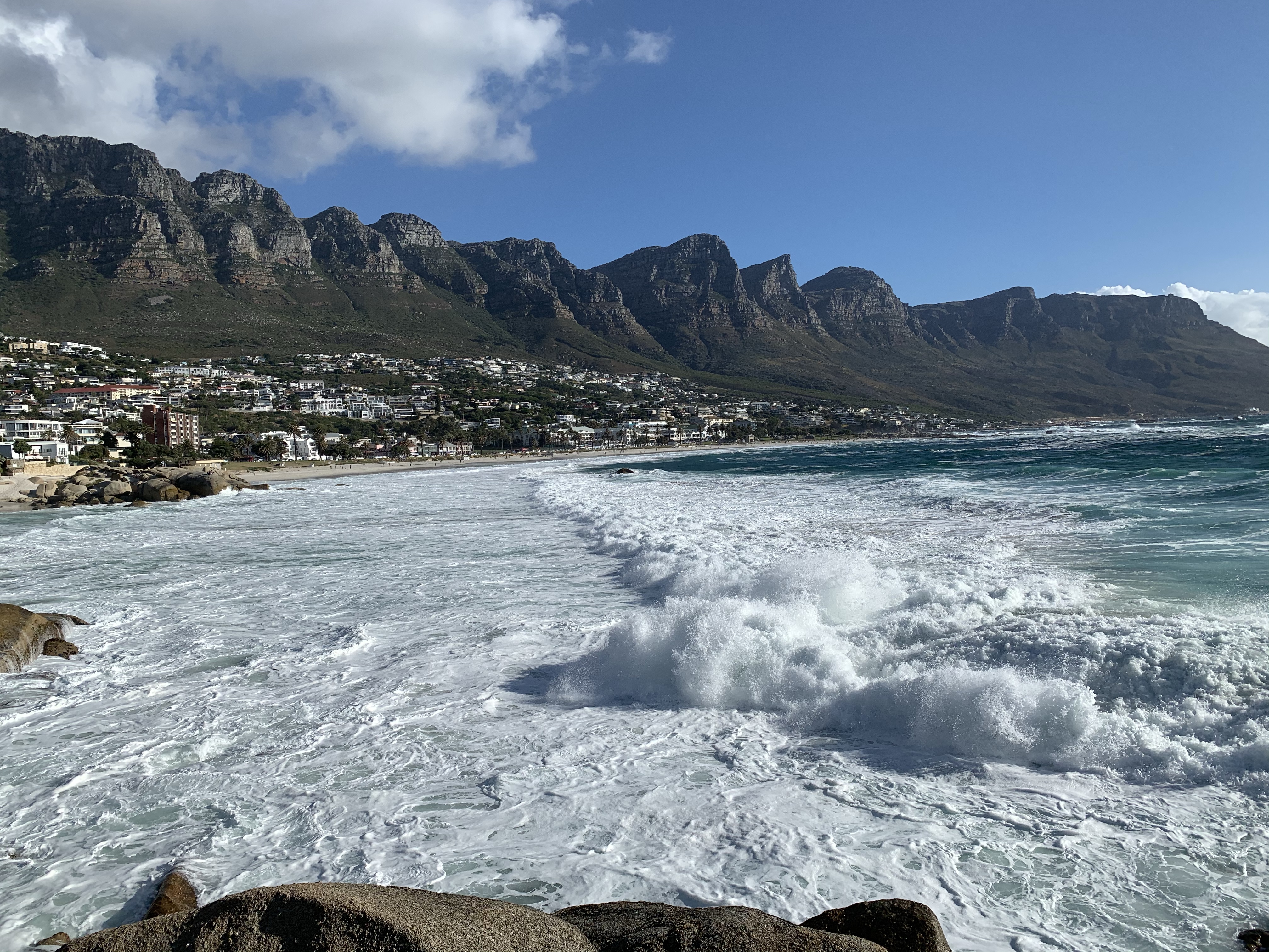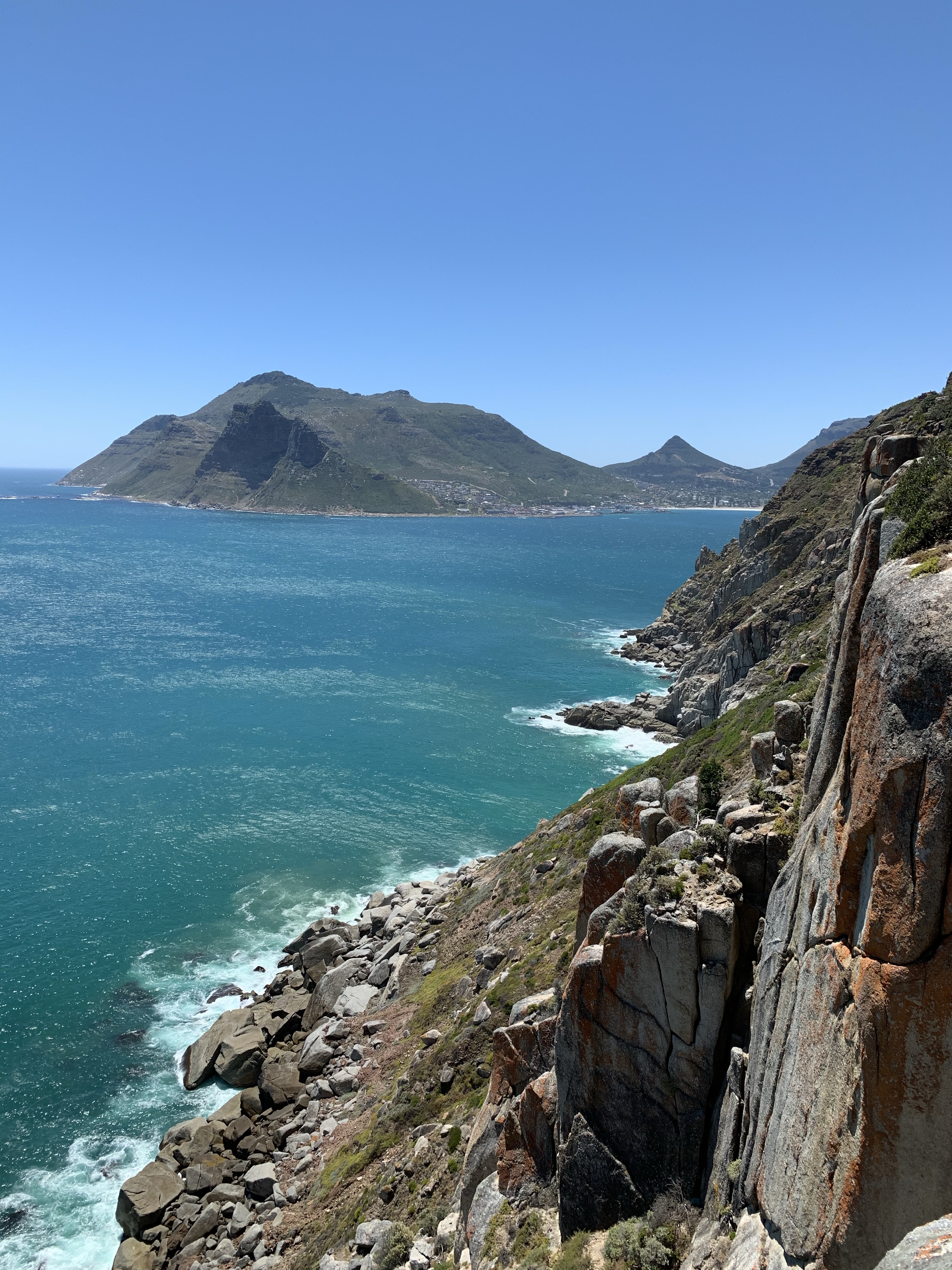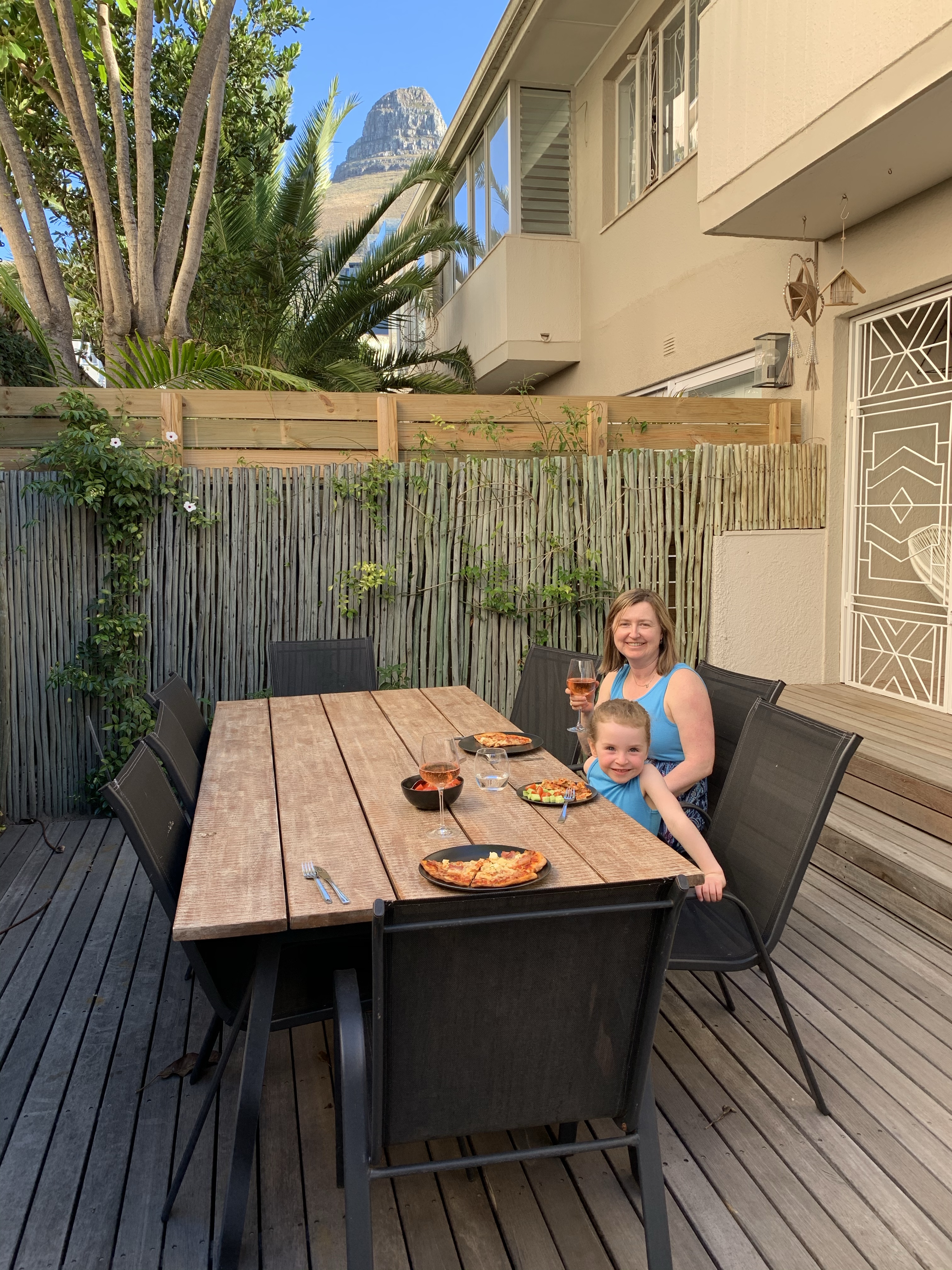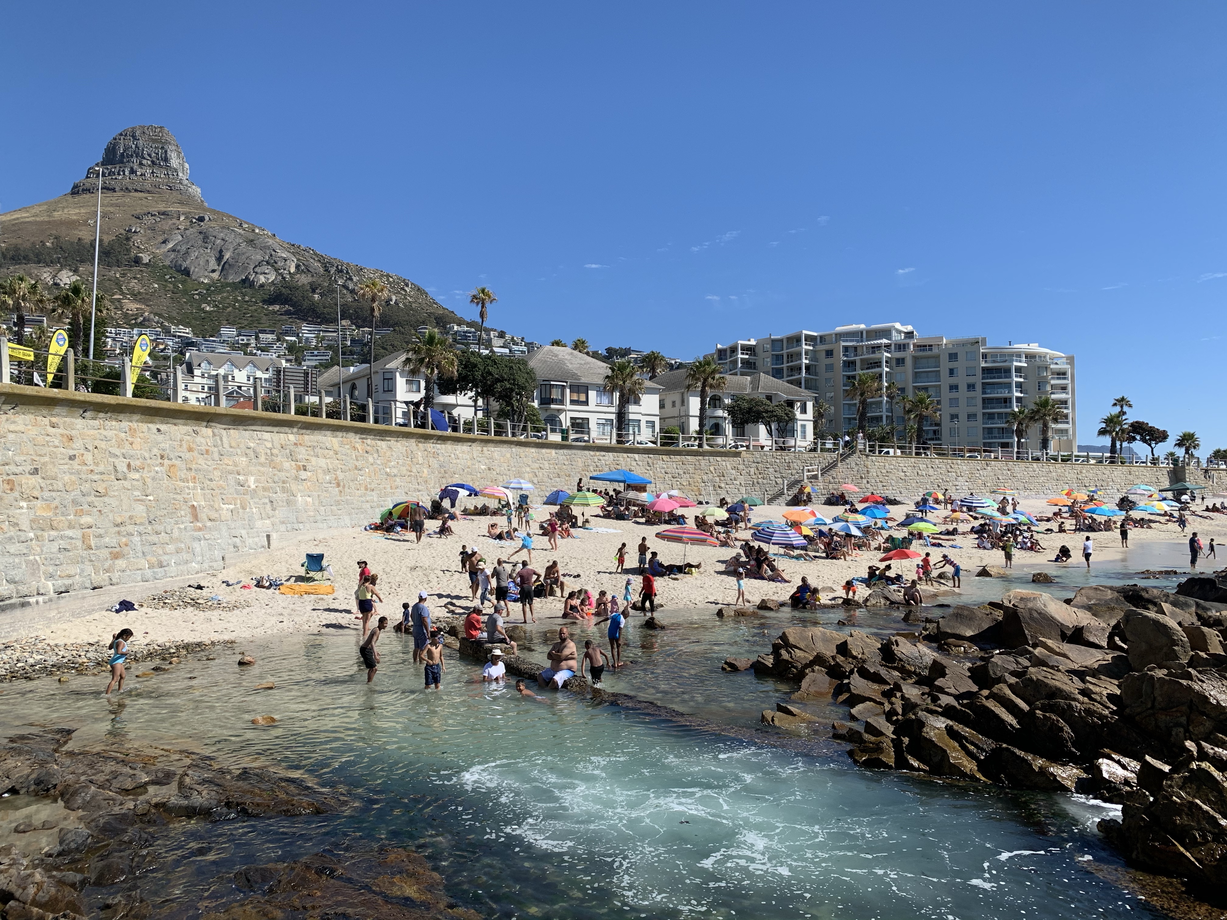 Back home in Sea Point, and the weather wasn’t windy at all here – told ya it could be different! So we headed over to Queens Beach which was about a 5 minute walk from our apartment. It’s nicely protected from large waves by some boulders just offshore, and also hosts a uniquely Cape Town beach feature – a tidal pool. The tidal pool is filled slowly with water from incoming waves, and circulates out to the main beach. The water is constantly refreshed, yet isn’t as cold as the open ocean and is protected from waves, undertow, and other currents. It’s in the bottom of the second picture. We stayed here for a couple of hours before heading back to our patio for dinner!
