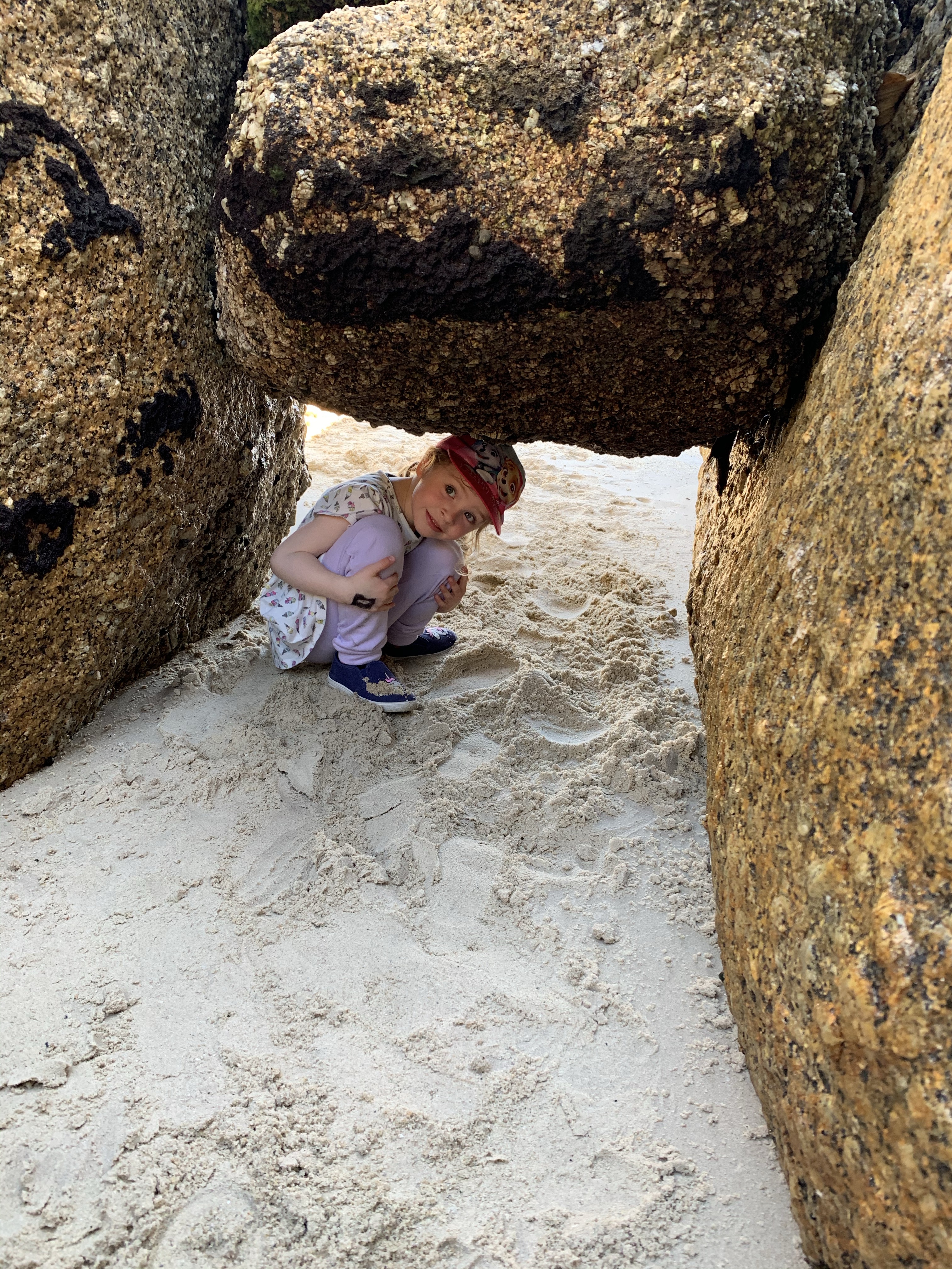 Eli under the rock tunnel; penguin under the rock tunnel next!