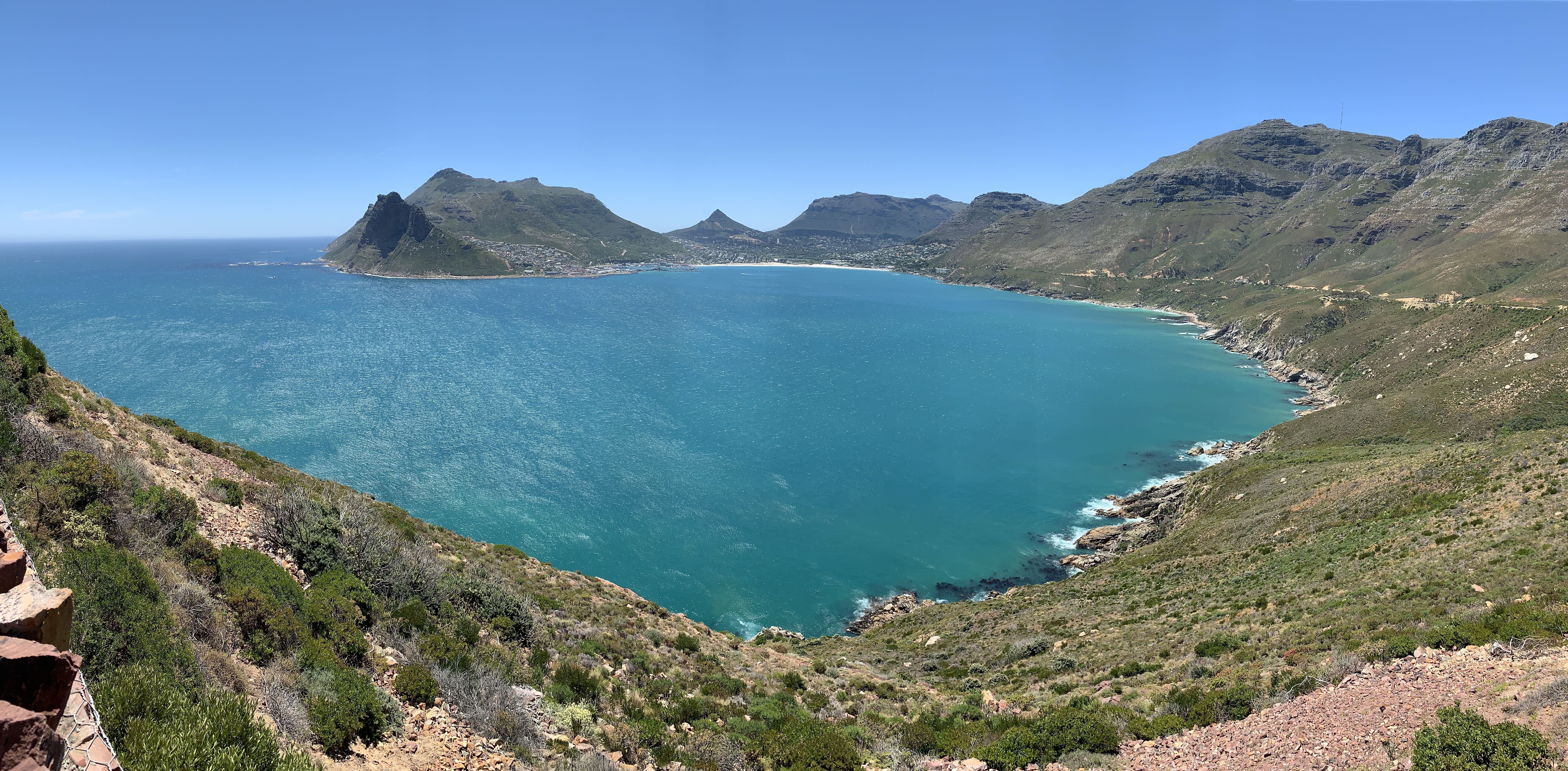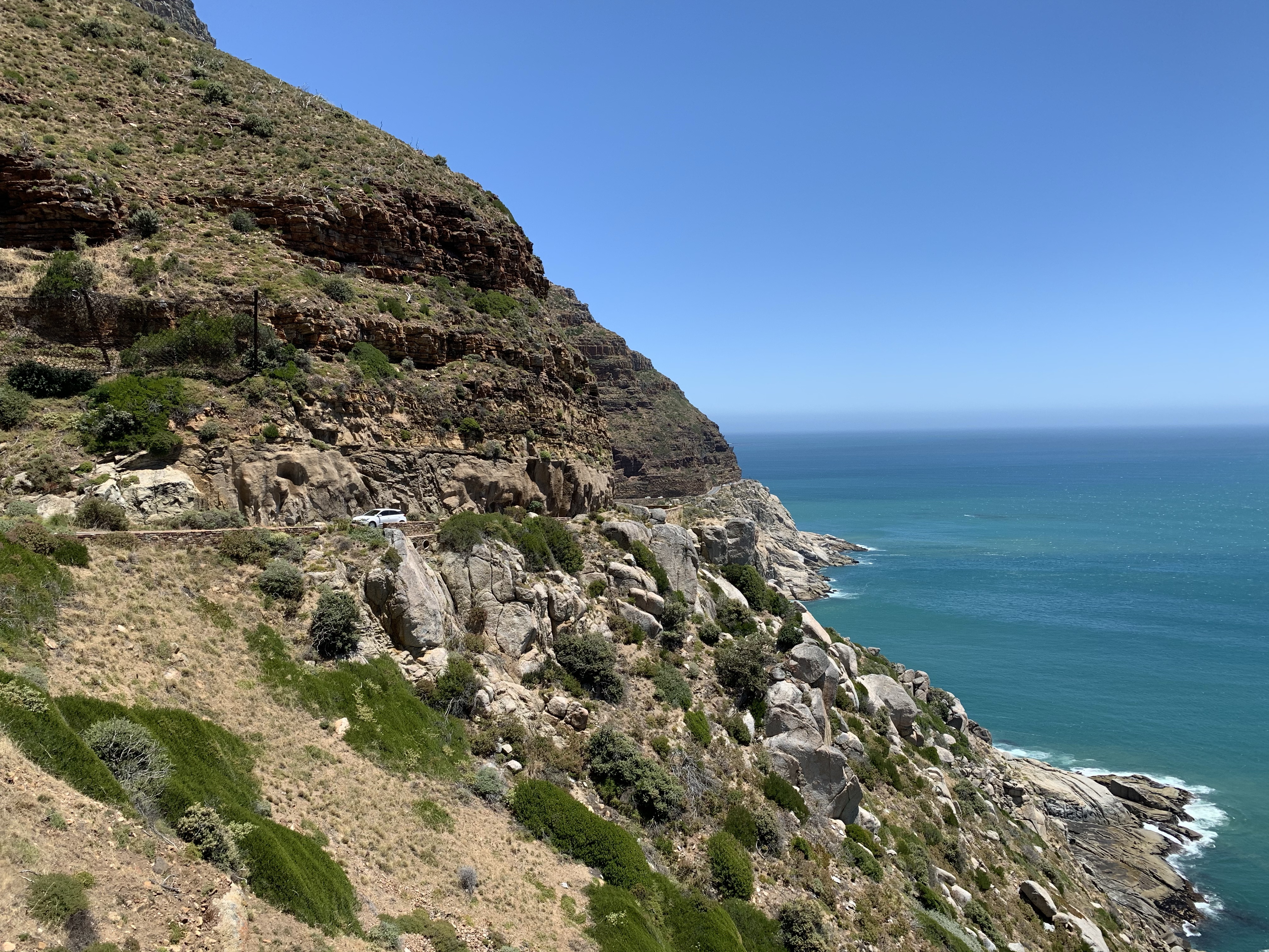 On the way home, we took the beautiful Chapmans Peak Drive on the west side of Cape Point. The road is narrow, average speed about 20 km/h for sections, and has some nicely spaced pullouts for viewing and photo taking. If you look at the fourth photo from the helicopter series, you can see how the road hugs the cliffside above the sea.