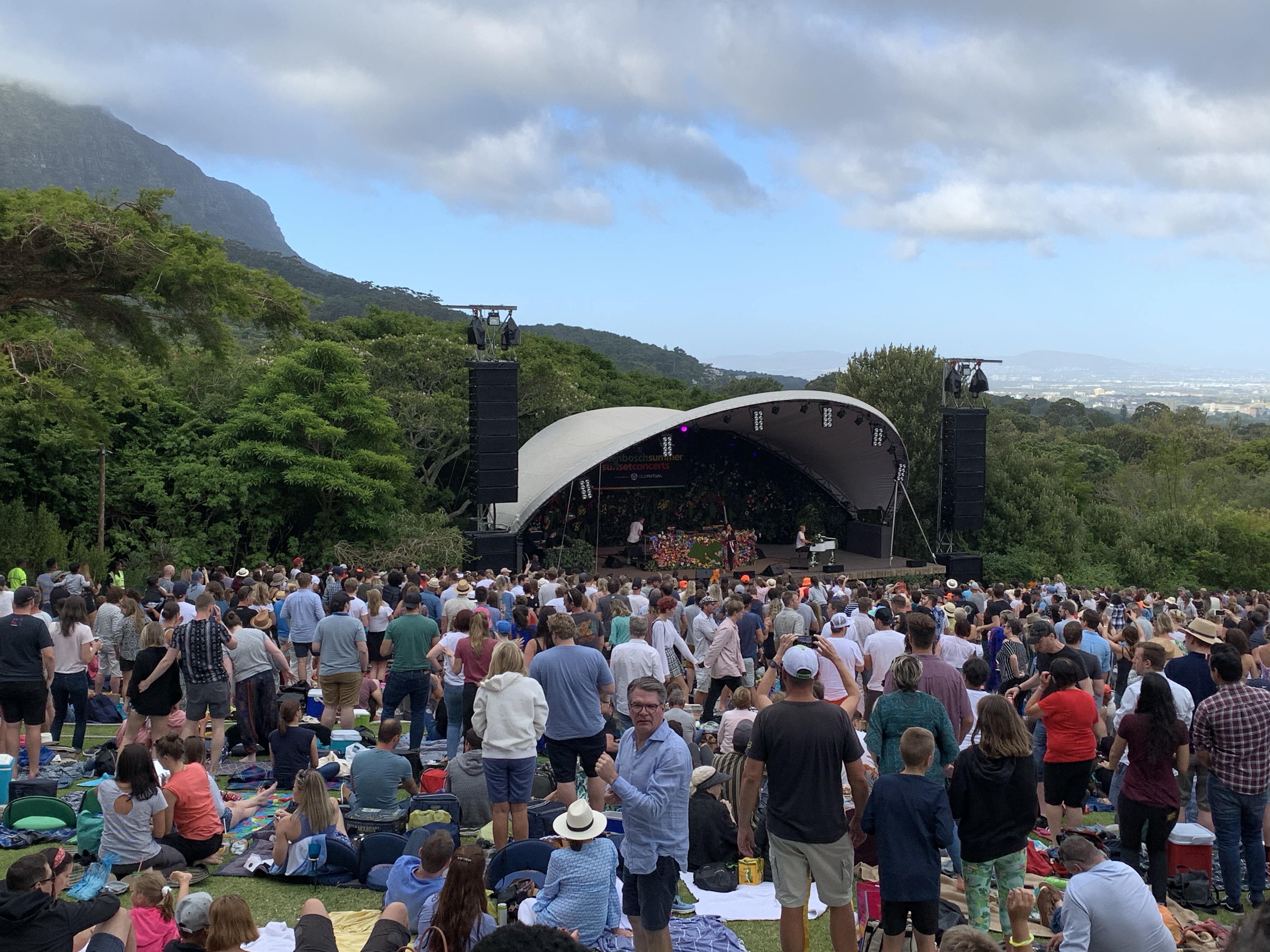 And here we are at the real reason for our visit to the Gardens – to take in one of the famous Kirstenbosch Summer Sunset Concerts! These take place every Sunday evening in summer, are picnic blanket style (you bring your own blanket, food, wine, etc) and are very popular with locals. The show we attended was sold out in record time – it was the Cape Town band Goldfish. They play electronic dance music with real jazz instruments such as the double bass, keyboard/piano, flute, and saxophone. They have a very lively yet mellow style and their tunes are very catchy. The concert was a big hit for all of us especially as we’d become familiar with some of their tunes before heading down. She seemed to shy away most of the times that the camera came out, but Elinka danced for most of it!
