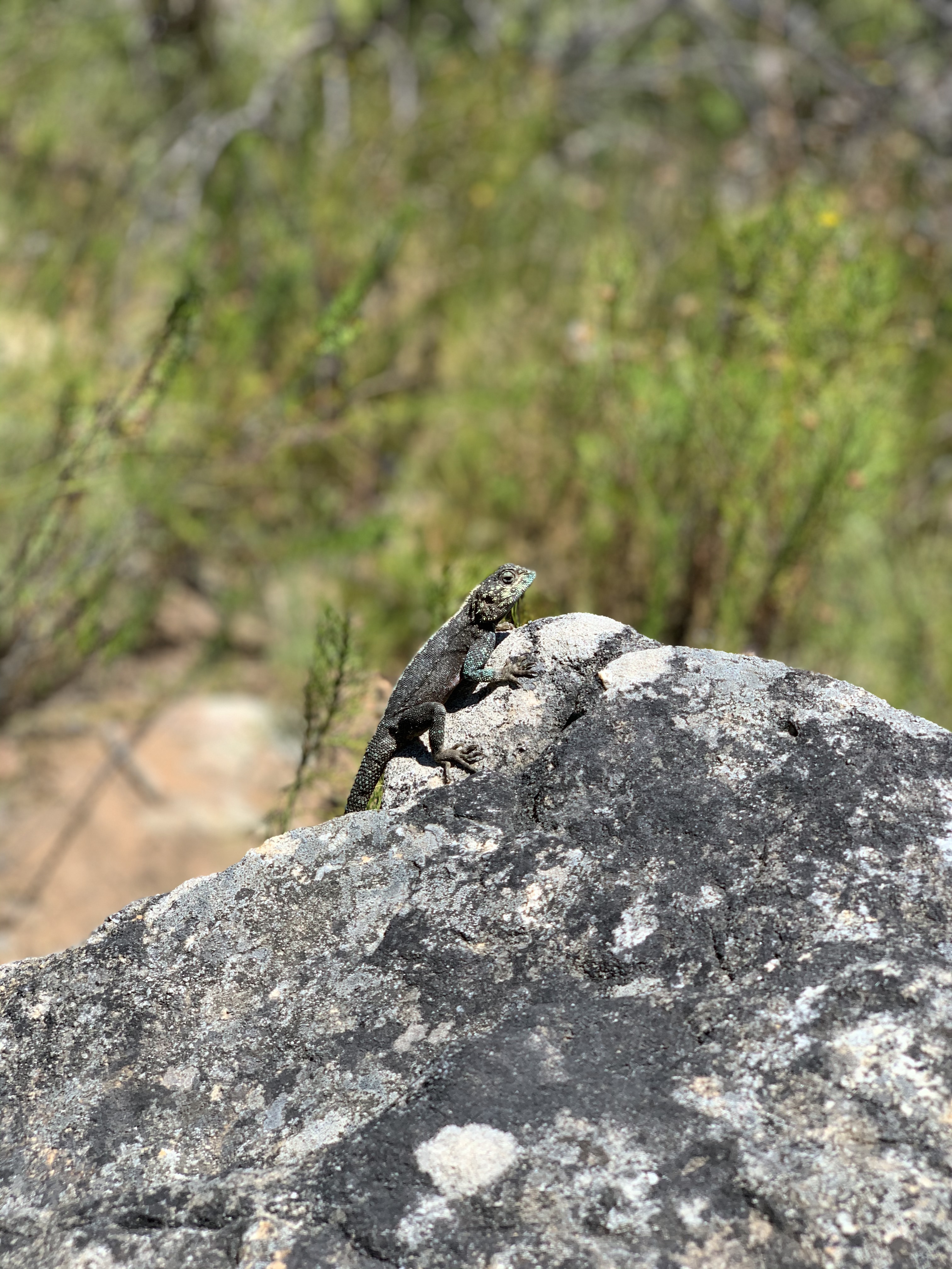 Finally at what will be the end of the hike through the desert for us, we reach a lush overhanging cliff with water sprinkling down from above which provides air conditioned shade for a lunch stop. Just below us some more scrambling leads down to the lower waterfall which pours into a pool that looked awesome for swimming for adults – way to deep for kids. The highlight of the trip was the upper waterfall and pool which wasn’t much further but required more scrambling and Elinka had enough already by this point. It was already 33 degrees out and we needed to get back before we all expired. Not before seeing some of the local fauna beside the pools, though.