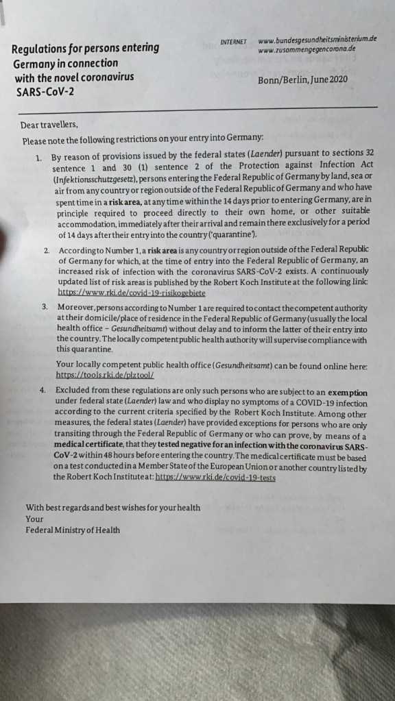 And that’s that. Now in isolation for 2 weeks. I have lots of friends offering to help out getting me the things that I need and I’m already fully stocked with groceries. It will be boring but just fine. I hope that the next time I’m travelling that the situation will be improved and the experience closer to normal!