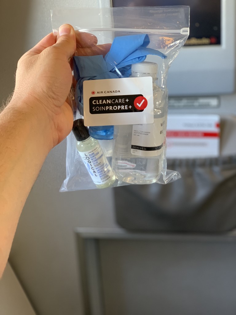 Remember what I’d received earlier in the day from Lufthansa, even on the short flight? As a reminder, here is the Air Canada offering. Hasn’t changed since we left. Bag of sanitary goods and a bottle of water.