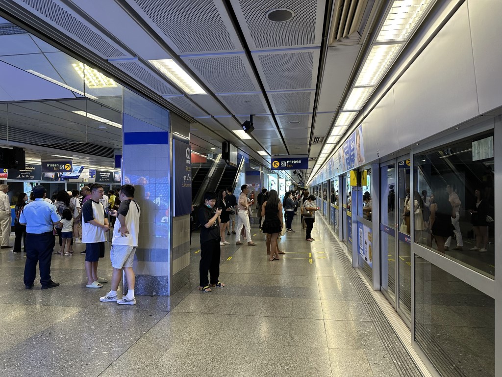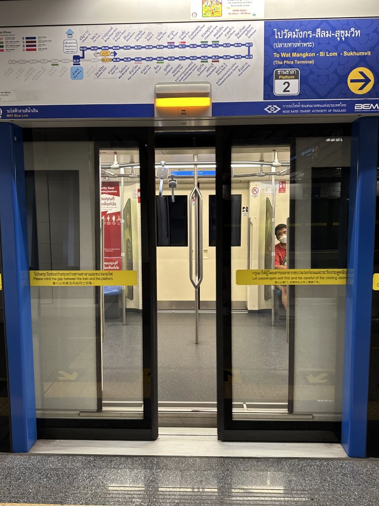 Like many metro systems have these days, the Bangkok metro has double doors in the stations – a fixed door on the platform that only opens when the train doors are opening, to prevent people from ending up at track level. I didn’t realize the hours of operation and I was lucky enough to catch the last train of the evening from this station.