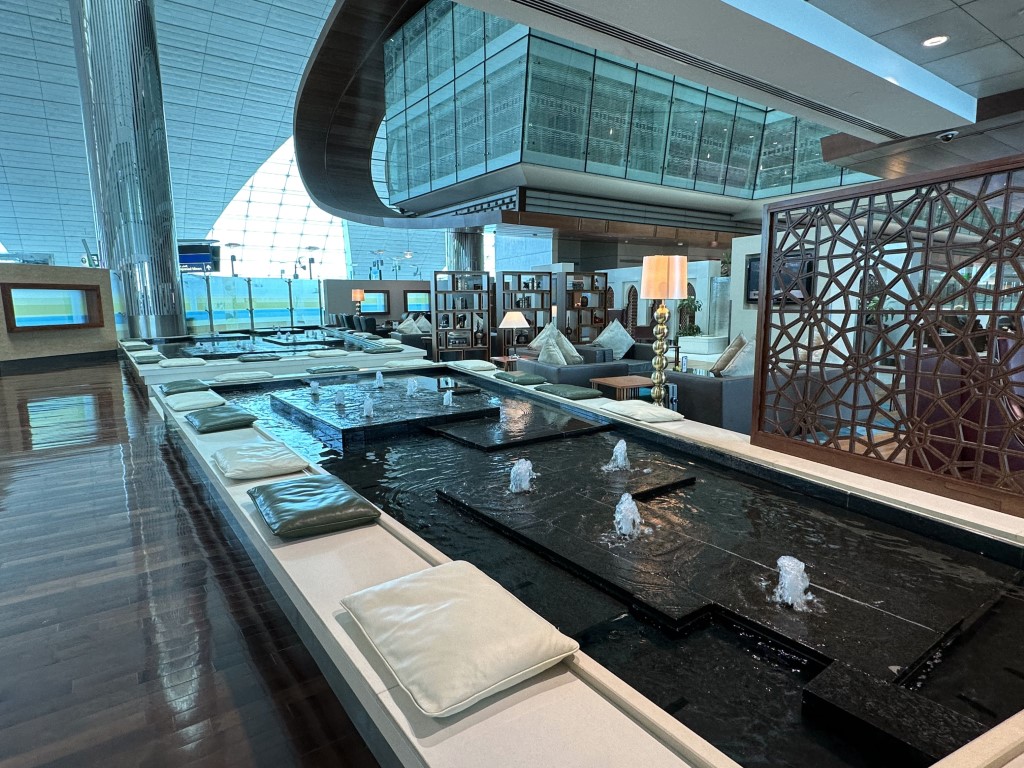 Originally, my idea was to see if I could leave at least my rolling bag and possibly my backpack in a left luggage area at the airport, then head back down to Old Dubai for a walk around the spice souk and the gold souk for some pictures and maybe a ride on an abra. But the left luggage service was shared with the general baggage irregularity counter and the line was moving very slowly. So rather than wait and then take a trip down to the souks for basically what would be a 20-30 minute walk, I gave in and just went through passport control, security, then headed to the First Class Lounge in B concourse at DXB Terminal 3.