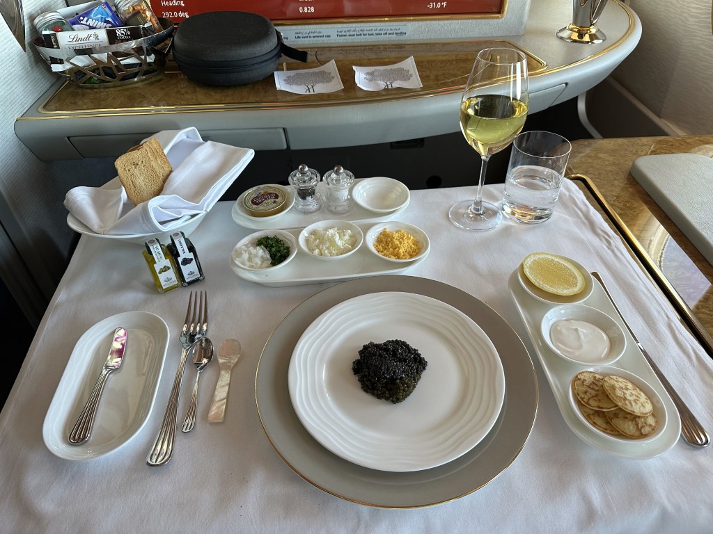The rest of the food and drink service is very similar to yesterday’s flight. I just have a couple servings of caviar and some dessert.