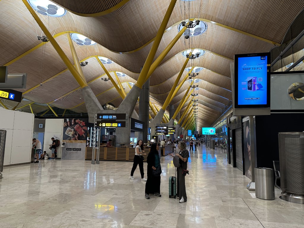 We arrive in Madrid’s massive airport not too far behind schedule.