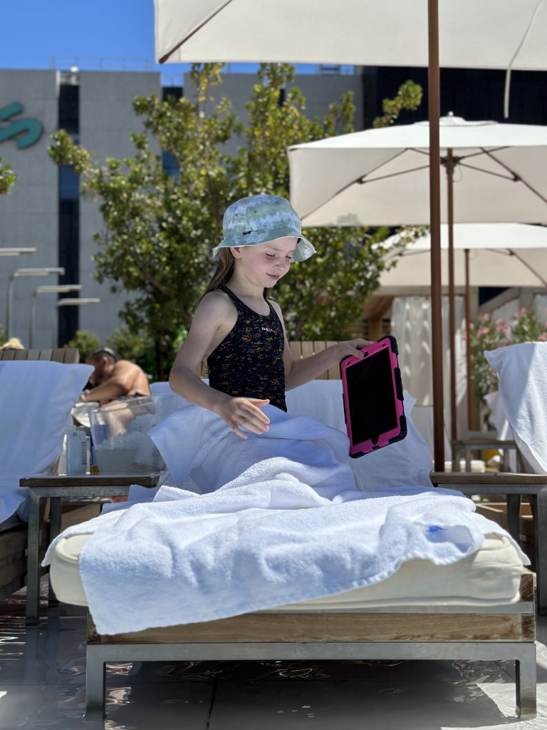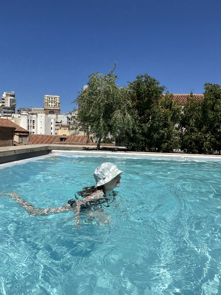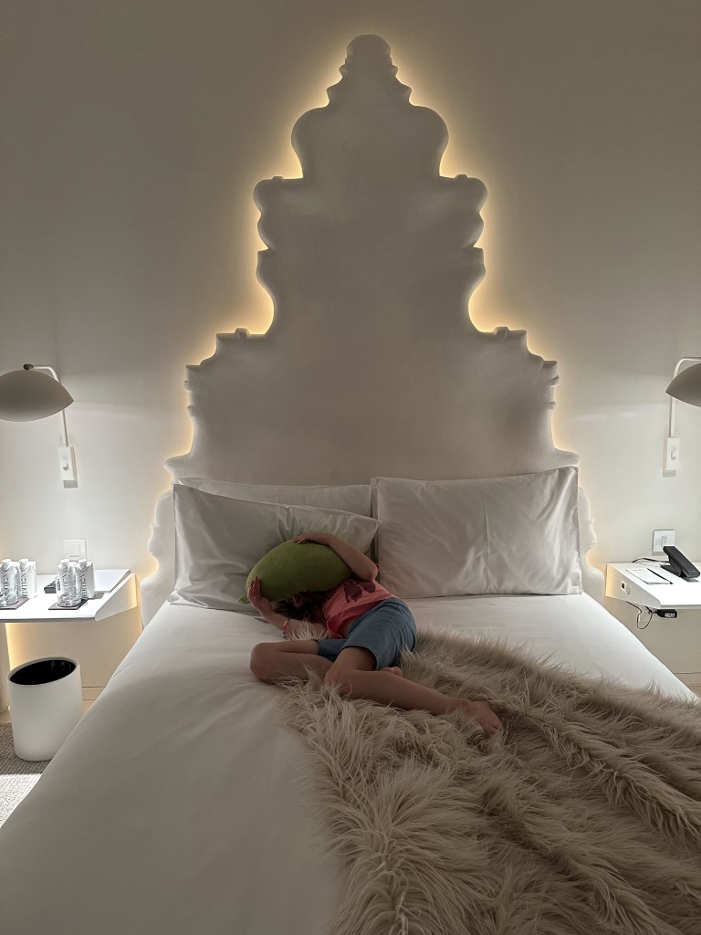 It’s midnight when we arrive at our home for the next 4 days – The Madrid Edition. Ellie hides under her avocado stuffie in the beautiful bed.