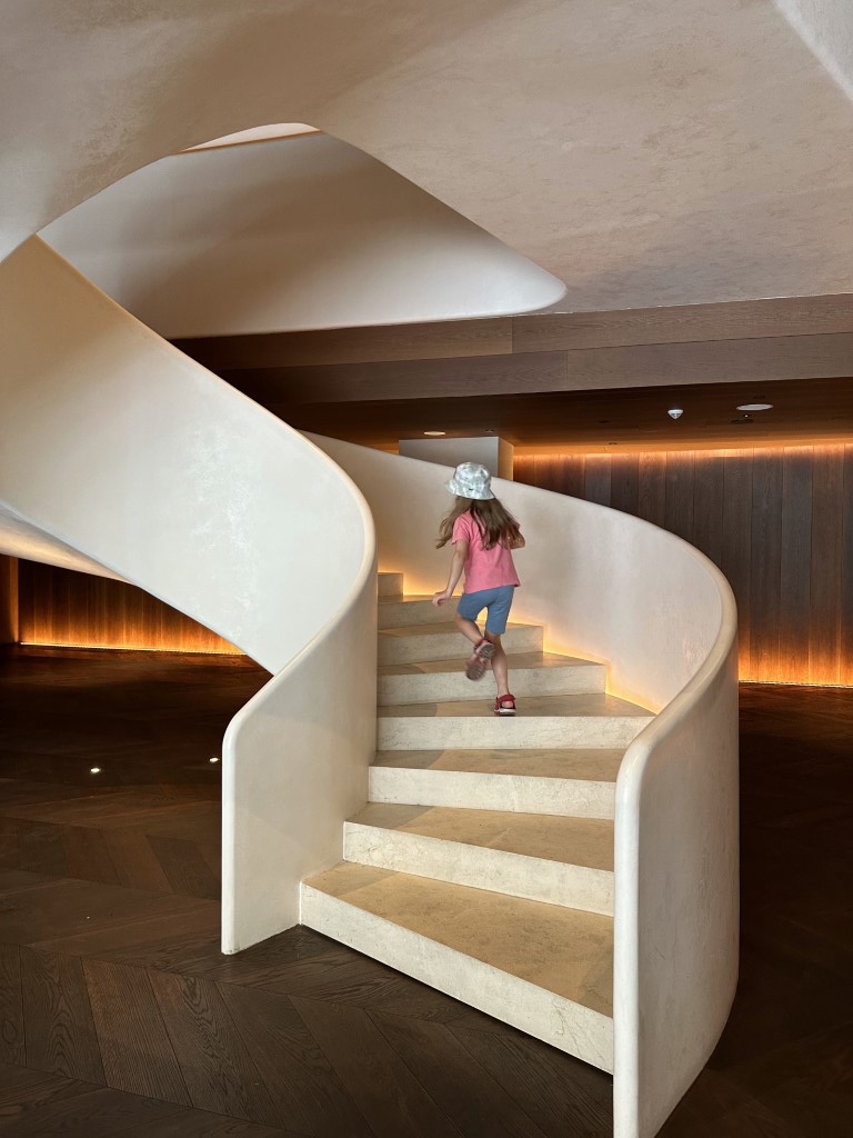Back at the hotel, we go up the cool spiral staircase to the lobby.
