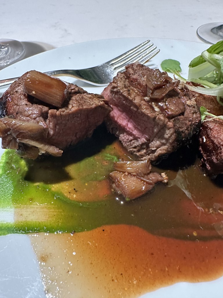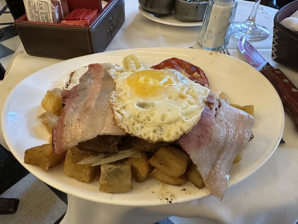 Thankfully one of the very few restaurants that was open was right next door to the hotel so I had this giant platter that had a 10 oz steak hiding under the bacon and fried egg. For that and a glass of wine was the equivalent of 20 USD.
