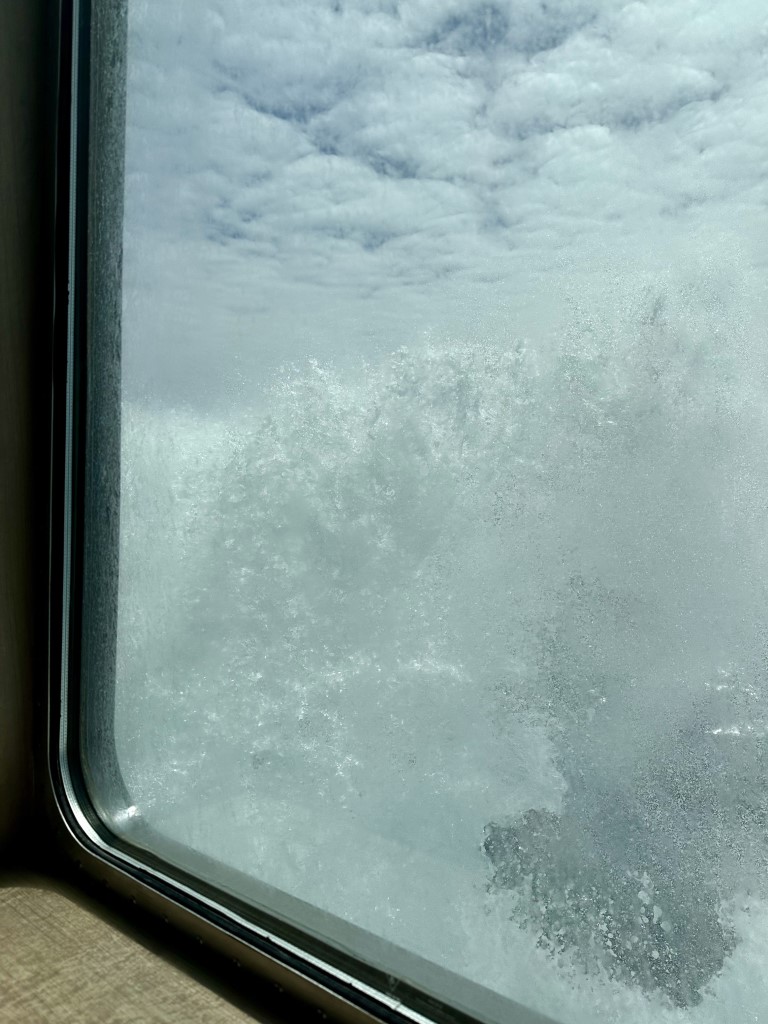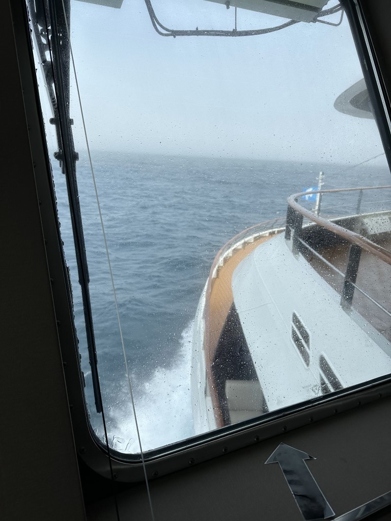 The morning after departing South Georgia we were indeed met by the tail end of the ominous storm that had been displayed on the weather map. I enjoyed spending a couple of hours that day sitting in the lounge on the 4th deck looking out at the view which was like this most of that time. If you look back at the first pics of the ship in Grytviken, South Georgia, you can see the height out of the water that these windows are (the lowest big windows on the ship). Comparatively speaking it wasn’t nearly as rough as it could have been. The wind/sea conditions were an 8 out of 12 on the Beaufort scale. Some people (maybe including me) were a bit disappointed that it wasn’t rougher.