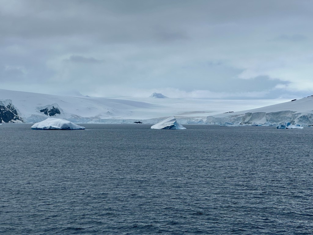 The bay was full of icebergs, ice in the distance, and an overcast sky. Very Antarctic feeling.