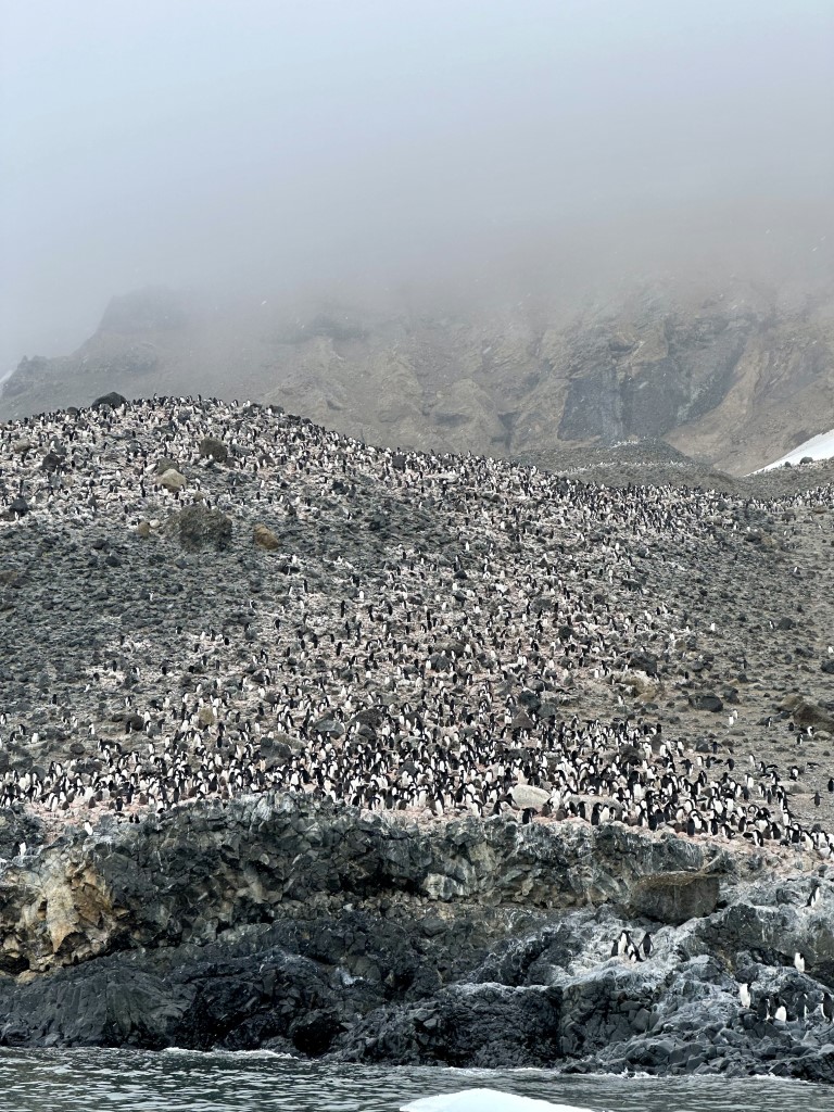 All of the dots going up these rocky slopes are penguins. But you didn’t even need to open your eyes to know that they were all there – the sound and the smell would let you know.