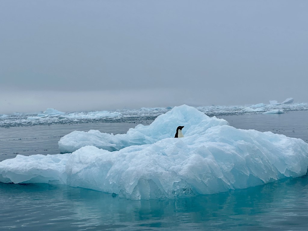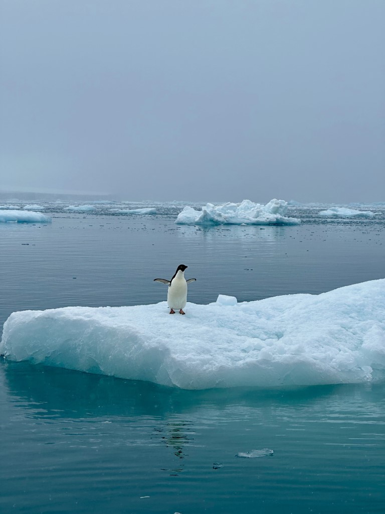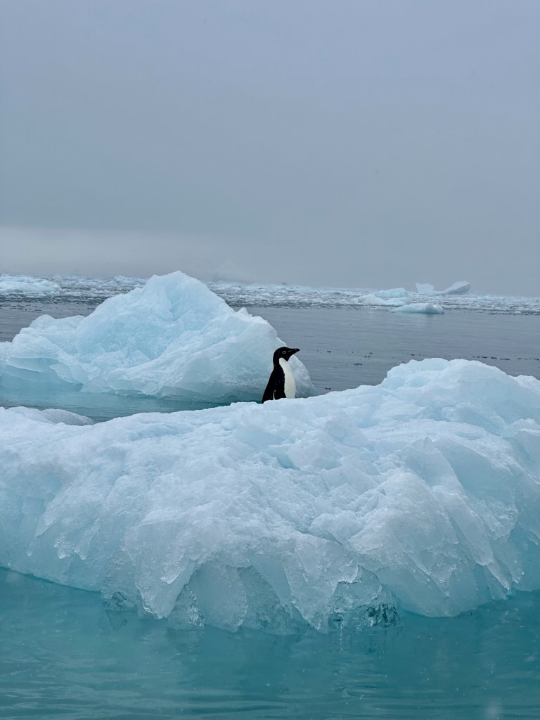 This lone Adelie penguin here wasn’t too far from the leopard seal, and he took turns jumping off the iceberg and swimming, or jumping up close to the Zodiacs. At the one in front of us, he jumped right in, pooped on the floor, and then jumped out again!