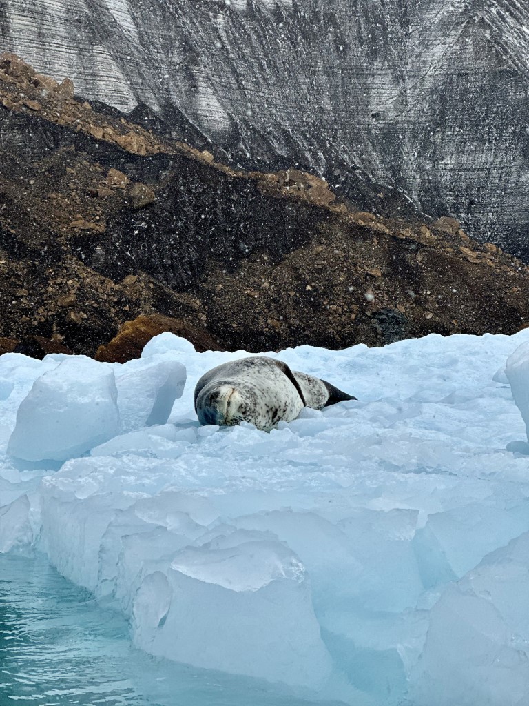 A leopard seal lolled on a bergy bit, with the dirty ice face behind.