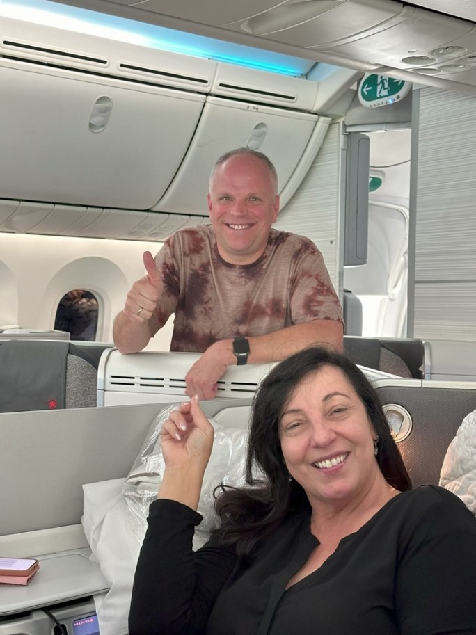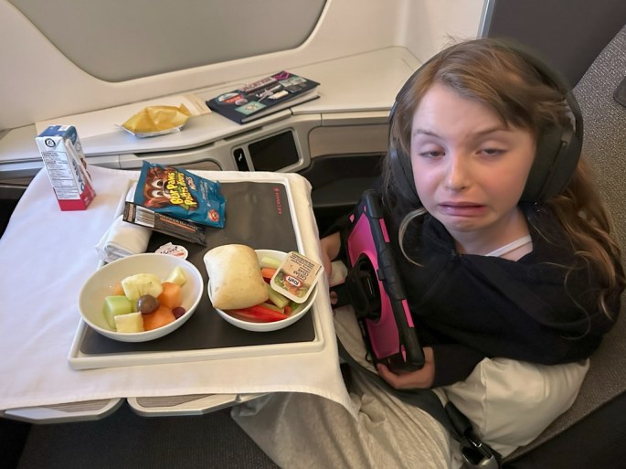 The trip started out well in 2 ways. One – we got our seats upgraded last minute just before boarding. And two – when we boarded the plane, sitting right in front of Ellie was a former colleague of mine who I hadn’t seen in 8 years!