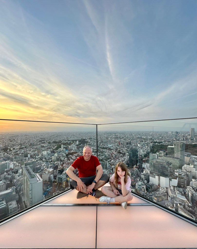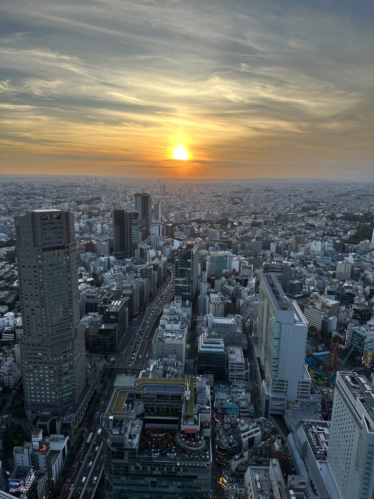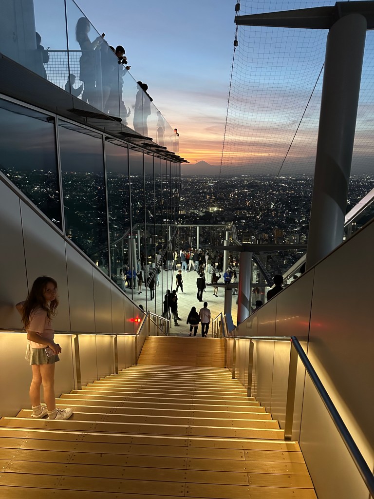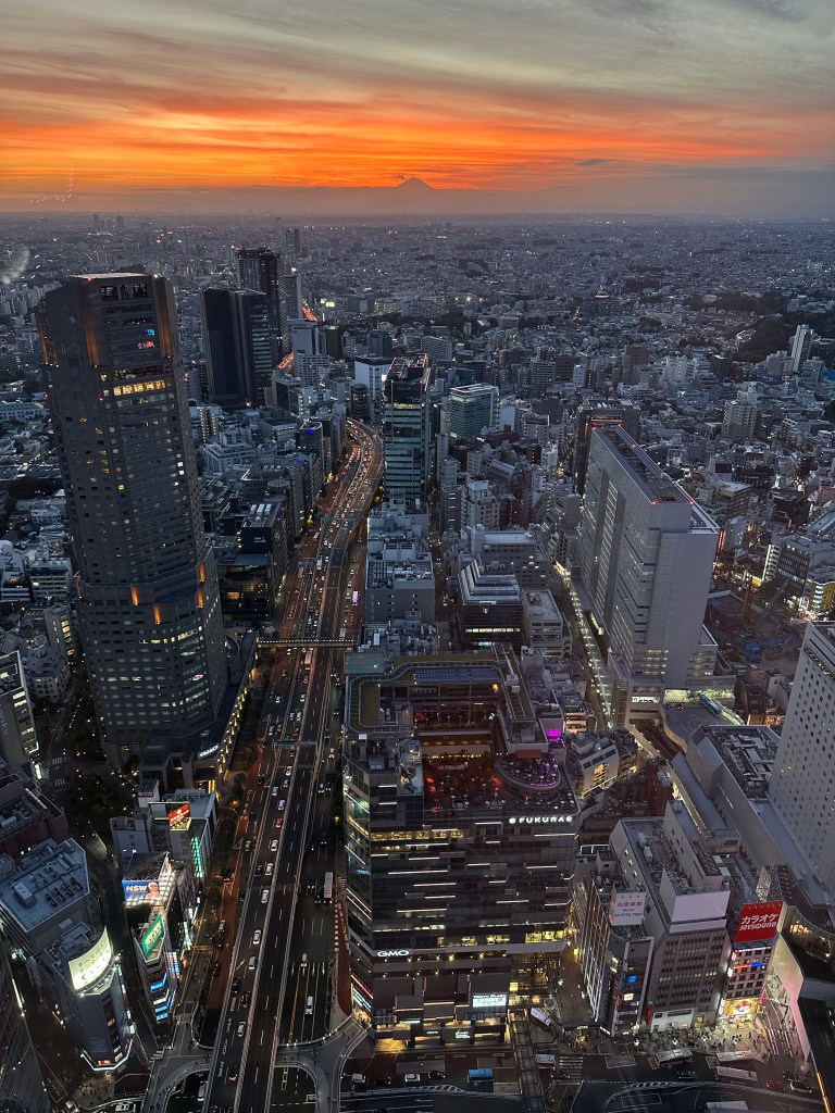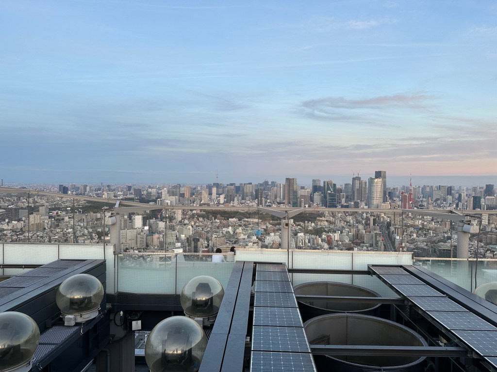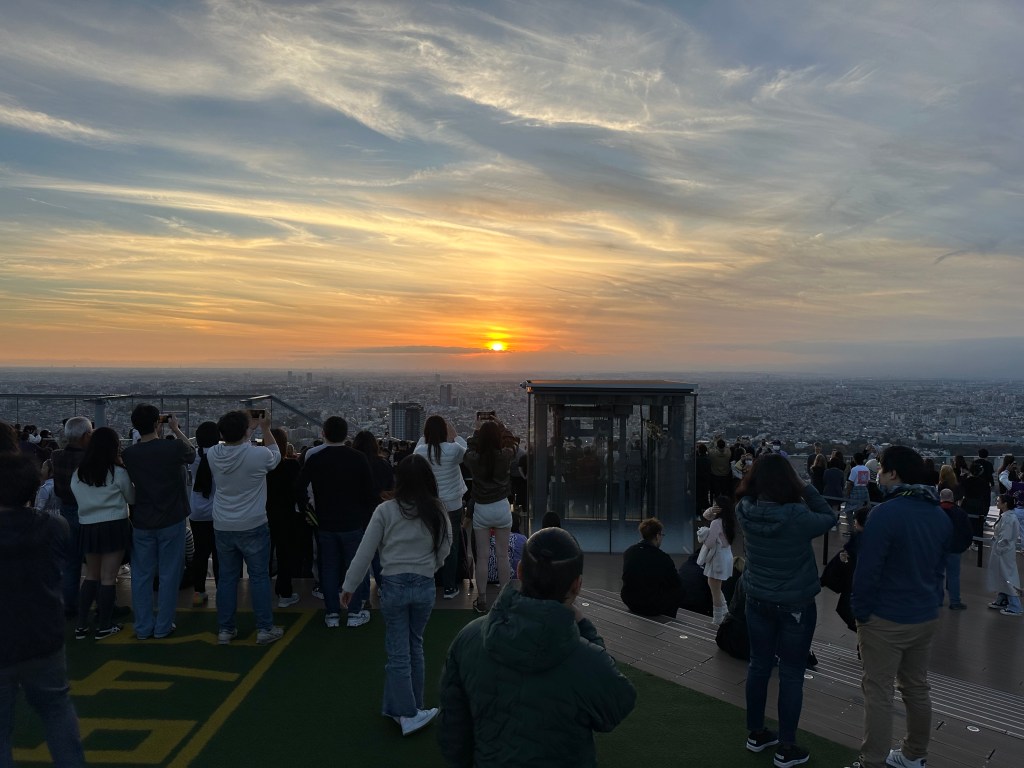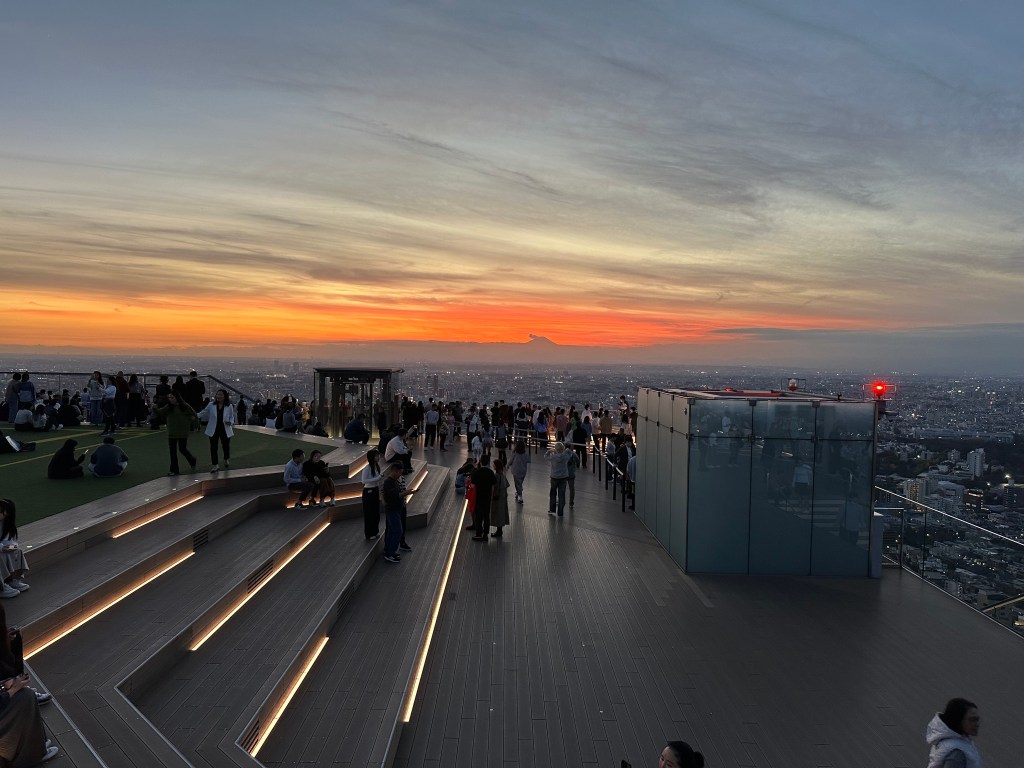 We’re going up to Shibuya Sky, a multi level observation deck at the top of Shibuya Scramble Square, 47 stories up. I wanted to get us tickets (timed entry) that would be suitable for sunset time, so we’d get to see the city in daytime, as the sun went down, twilight, and night. Sunset was 16:30 and I had tickets allowing us entry between 14:45-15:00. It felt almost as hard as getting Taylor Swift tickets to do this, as I had to set an alarm at exactly midnight Japan time 30 days prior. And as I tried to book my preferred time, 15:15 or 15:00, they’d disappear from the booking page as I’d enter my payment info. Fortunately, our time worked out just perfect for this day. I don’t wanna ramble on too long, as the photos will tell most of the story possible without actually being there – but we spent a whole glorious hour up there in the sun before it started to sink behind Mount Fuji, taking many photos and videos, exchanging photographer duties with other tourists at “THE” corner, and laying on the astroturf soaking it all in, or taking selfies.