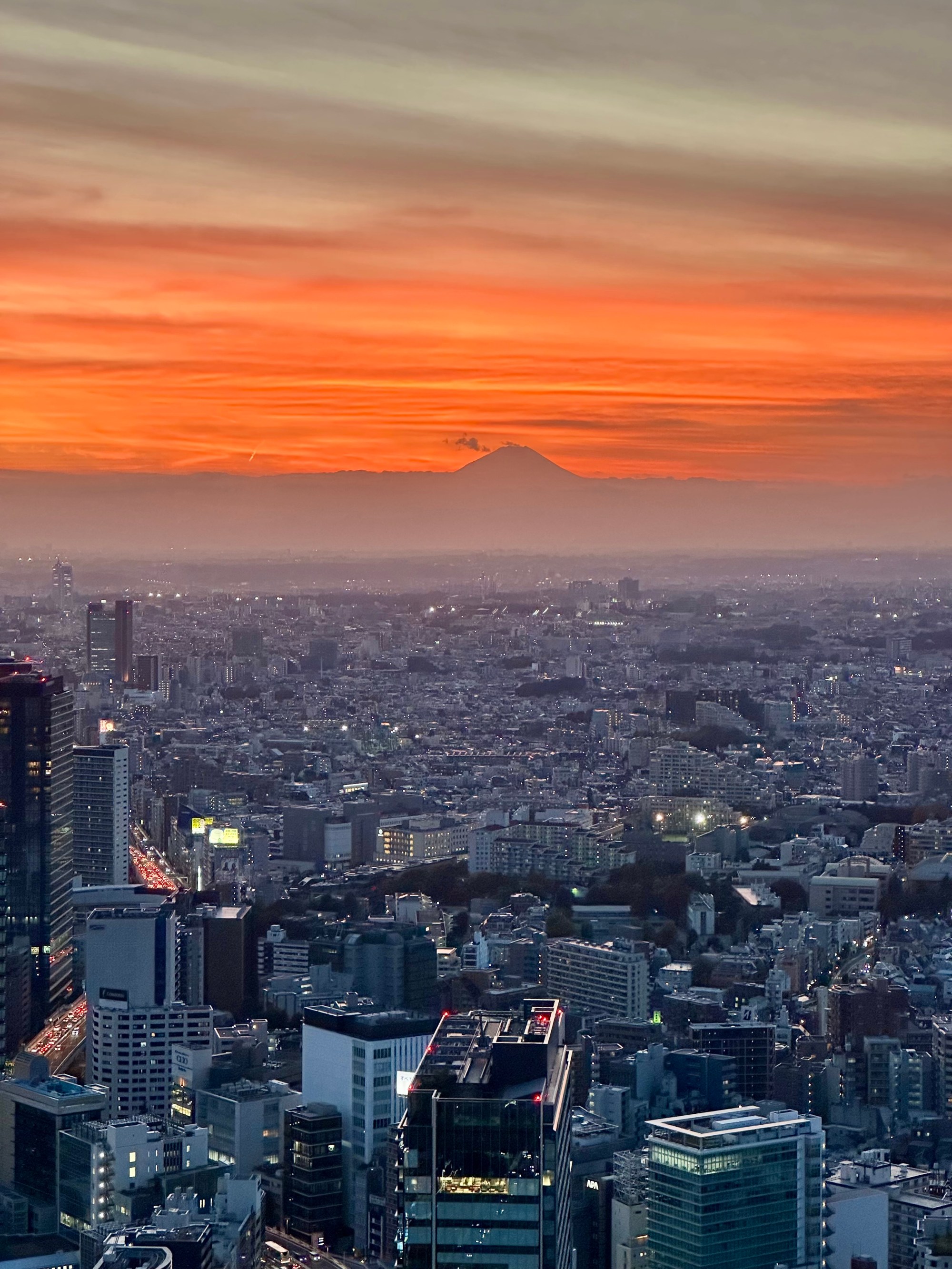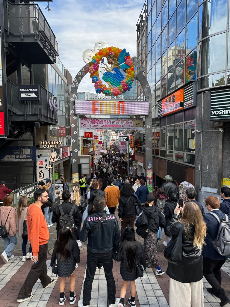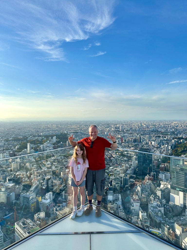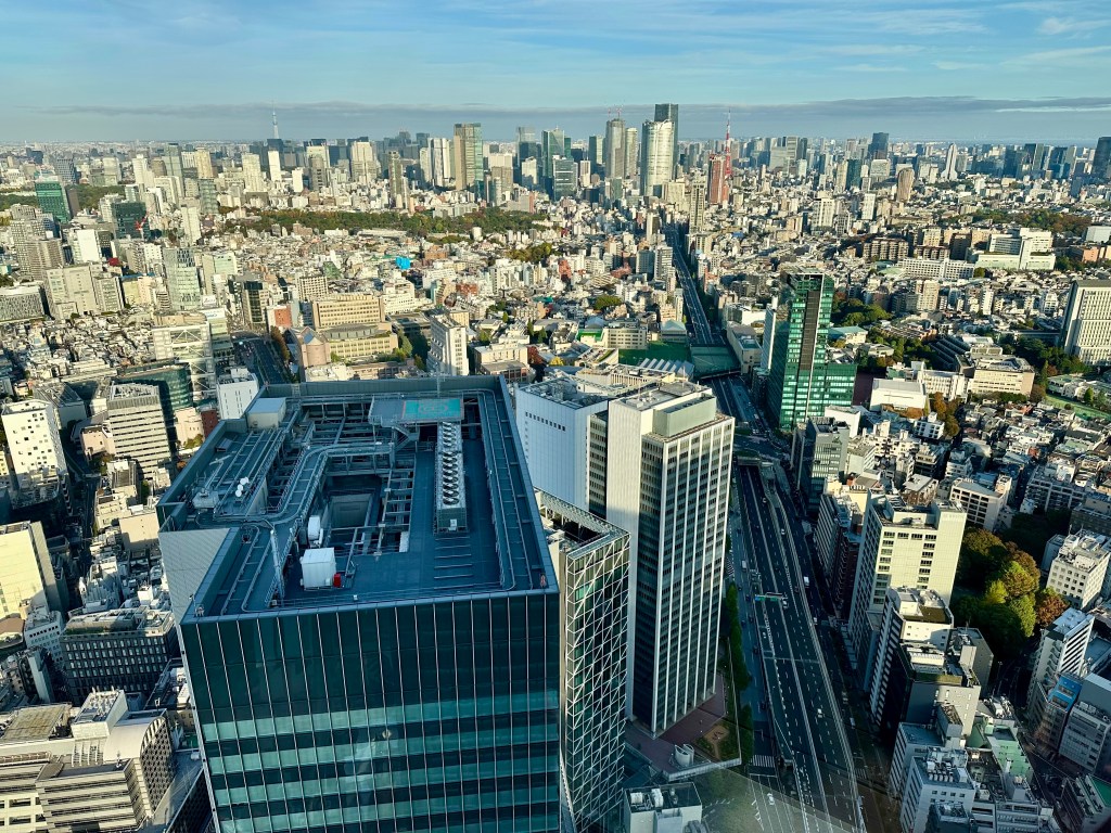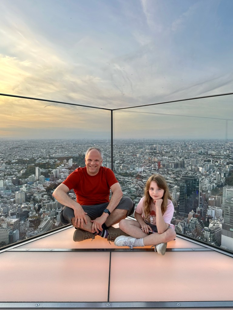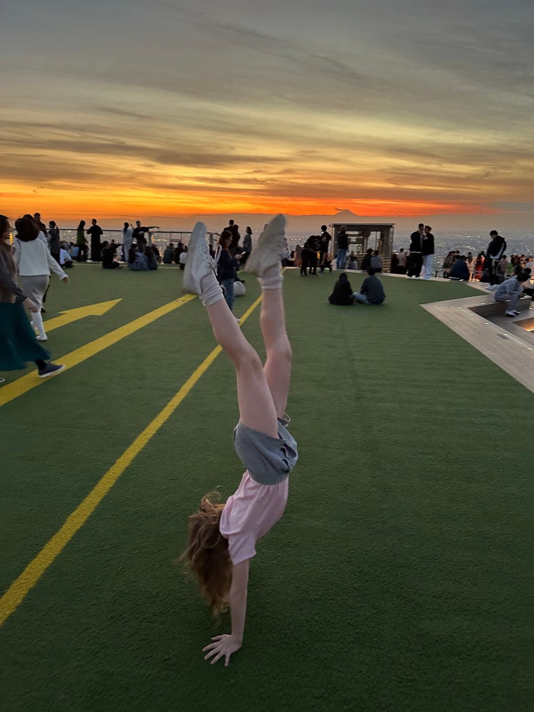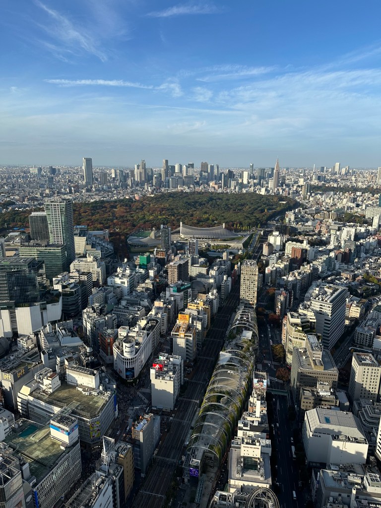 We’re going up to Shibuya Sky, a multi level observation deck at the top of Shibuya Scramble Square, 47 stories up. I wanted to get us tickets (timed entry) that would be suitable for sunset time, so we’d get to see the city in daytime, as the sun went down, twilight, and night. Sunset was 16:30 and I had tickets allowing us entry between 14:45-15:00. It felt almost as hard as getting Taylor Swift tickets to do this, as I had to set an alarm at exactly midnight Japan time 30 days prior. And as I tried to book my preferred time, 15:15 or 15:00, they’d disappear from the booking page as I’d enter my payment info. Fortunately, our time worked out just perfect for this day. I don’t wanna ramble on too long, as the photos will tell most of the story possible without actually being there – but we spent a whole glorious hour up there in the sun before it started to sink behind Mount Fuji, taking many photos and videos, exchanging photographer duties with other tourists at “THE” corner, and laying on the astroturf soaking it all in, or taking selfies.