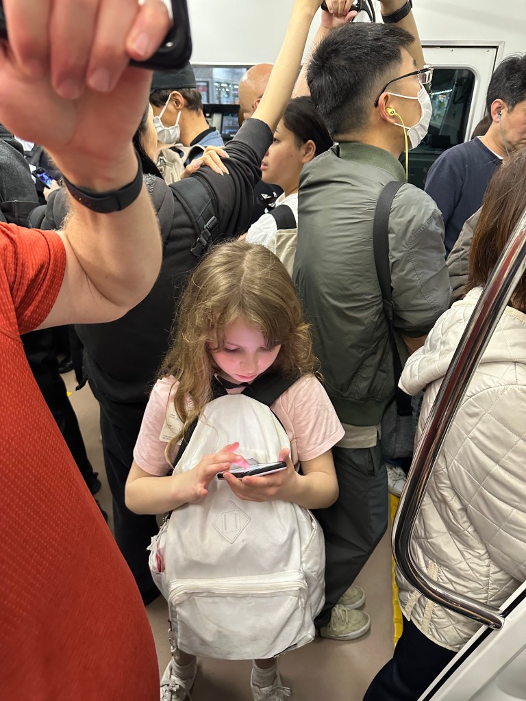 Very glad not to have the luggage with us here. Oh, and by the way, it’s a Sunday at 7 PM. Not rush hour. But it’s not considered busy until the central handstraps are in use, not just the side ones.