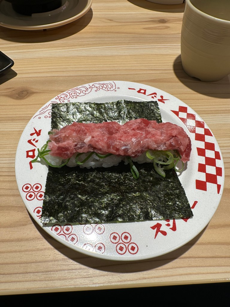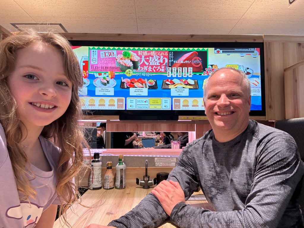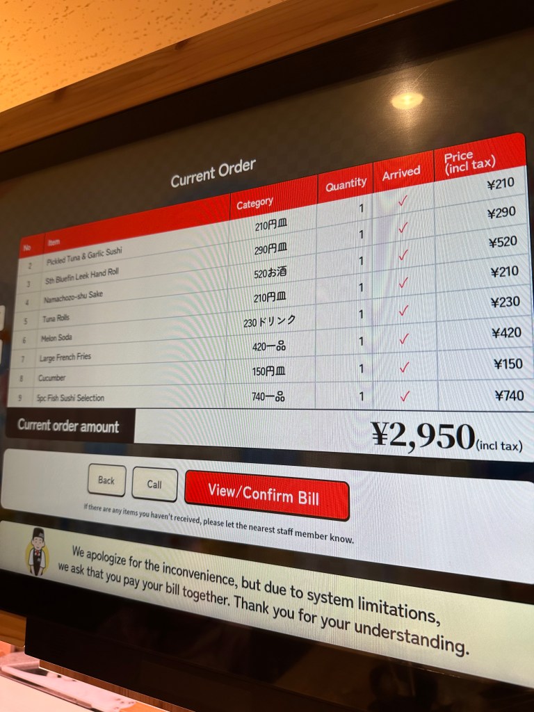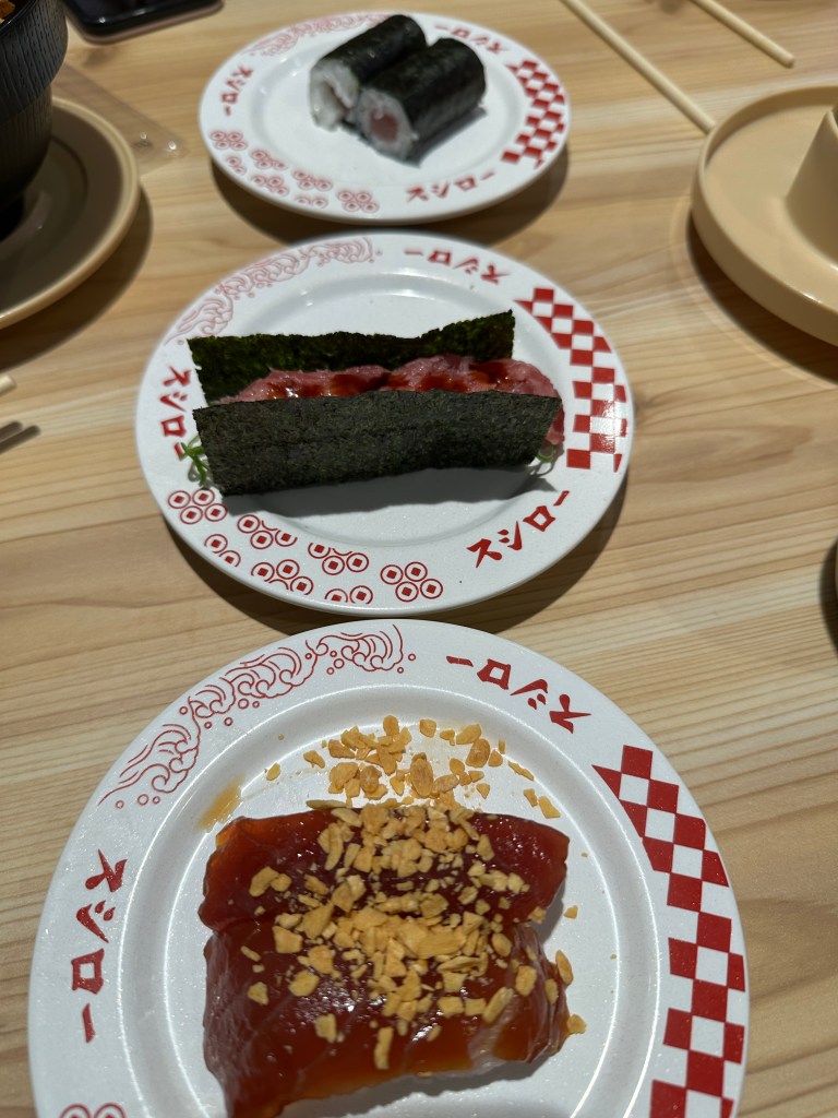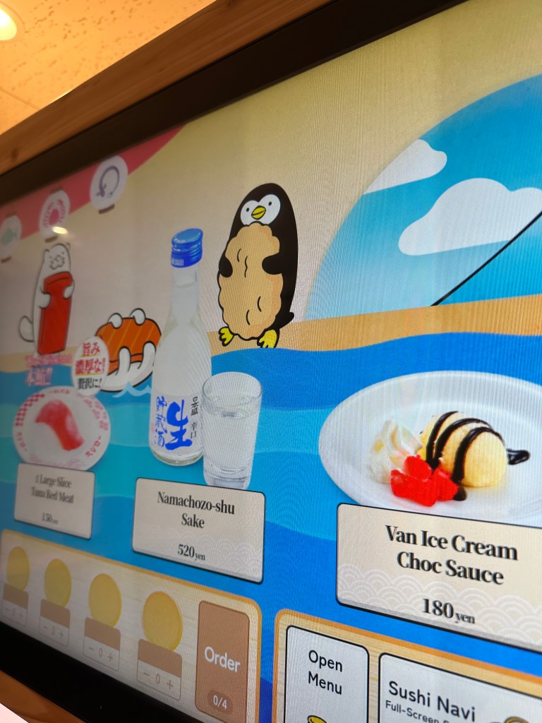 And then afterwards, a lovely conveyor belt sushi restaurant where you ordered from a virtual conveyor belt (behind us on the screens) and it popped out on the belt at your table moments later.