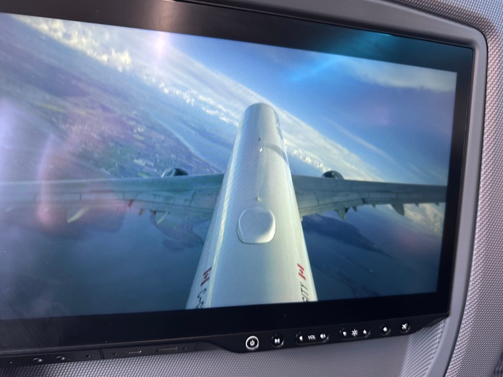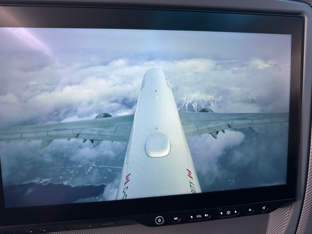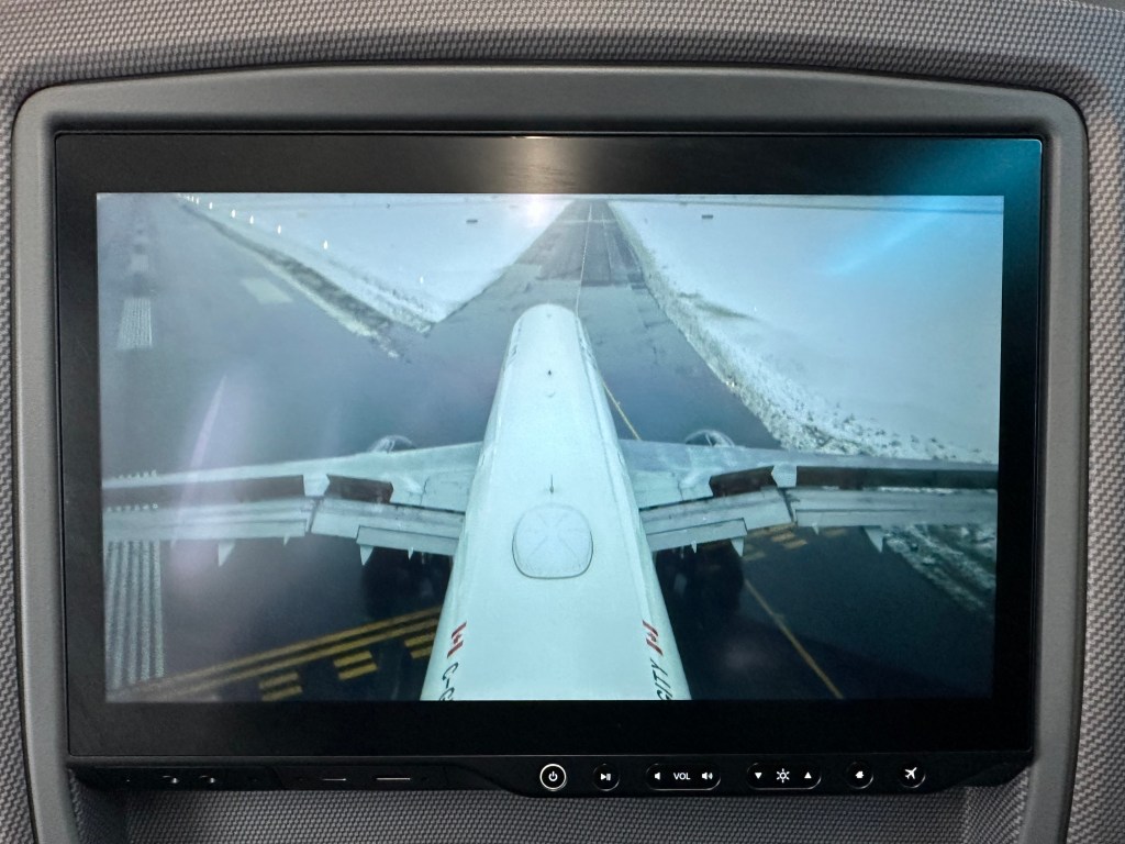 We had an uneventful 3.5 hour layover in Vancouver, then got on our last flight to Calgary. This was on a refurbished A321 that amongst other new features has a tail cam!