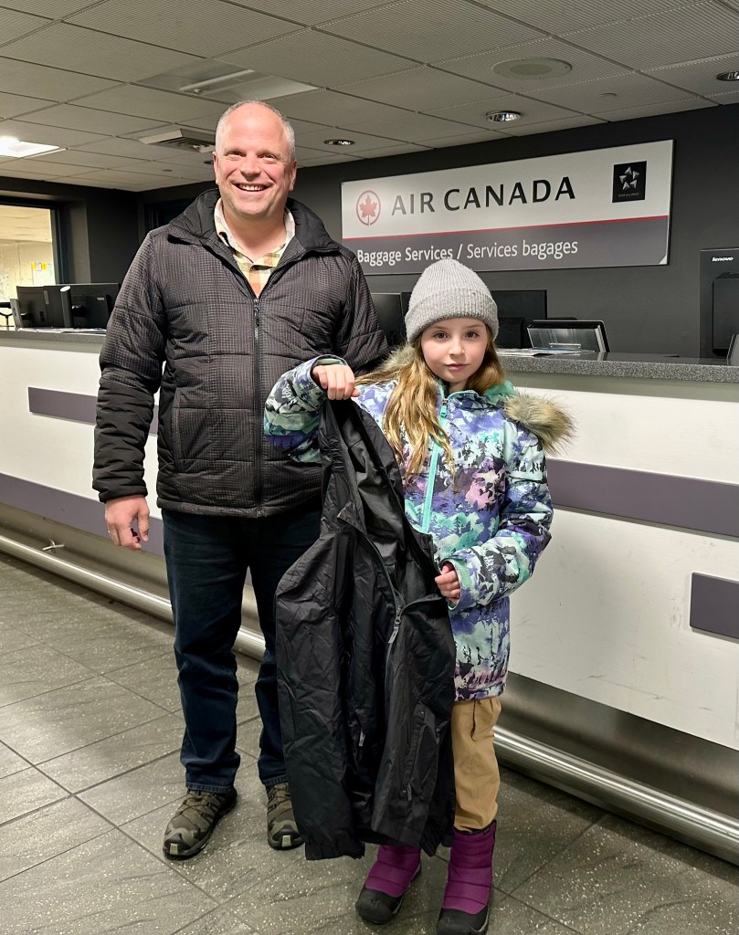 But the trip isn’t over yet! Unbeknownst to us, since it was very much winter in Calgary and windbreakers were not needed, Ellie had left her windbreaker in the pod on the flight from Tokyo to Vancouver. I always do a cursory check of her pod to guard against things like this, but she must have shoved it down in the footwell and being black, I was unable to see it. I was very surprised a few days later to be receiving a call from a Vancouver phone number with the name of Air Canada. A super helpful agent asked me if we were missing anything from a flight from Japan, and I said I didn’t think so… he then described the jacket and said that on one of the inner tags the label was marked Vizbar in Sharpie. So they proactively tracked us down and sent the jacket on the next flight to Calgary! Thanks so much to the Air Canada team in YVR for this, and also to Auntie Julie for labelling the jacket inside (it was a hand me down from Ellie’s cousin Brady).