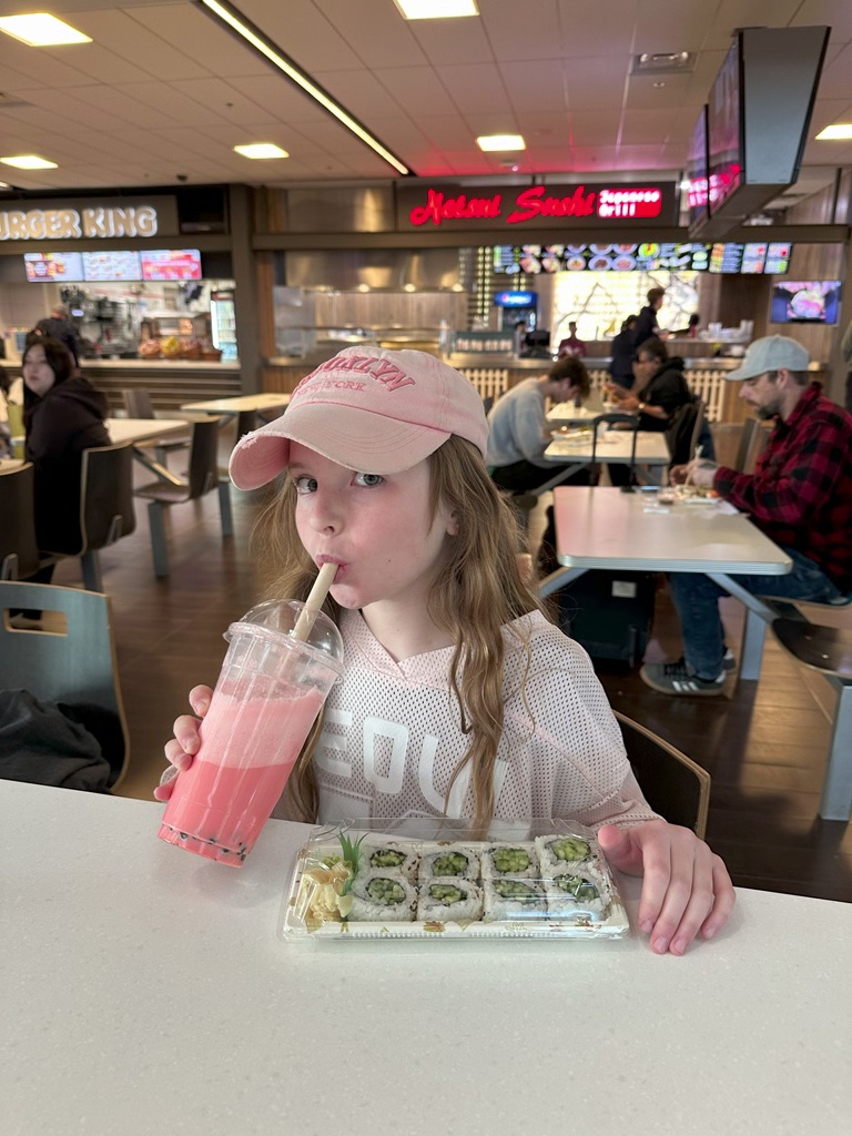 No meal service on our flight to Denver so Ellie had airport sushi (cucumber rolls) and boba. She approved.