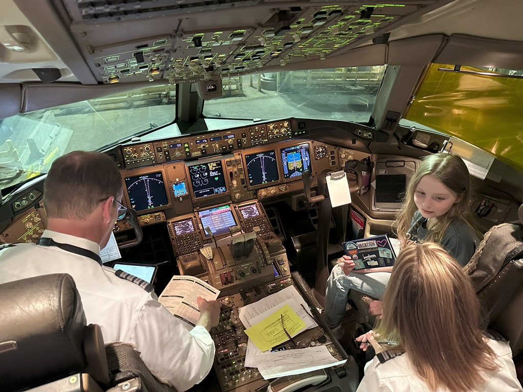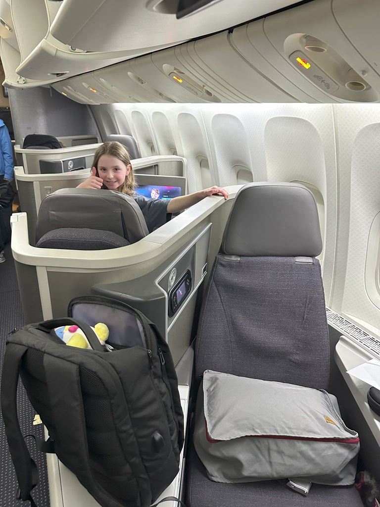 The flight attendant saw Ellie’s flight logbook as she was delivering pre-departure beverages and asked us if we wanted to come up now and get it filled in and take some pictures. The flight crew were super enthusiastic to see Ellie!