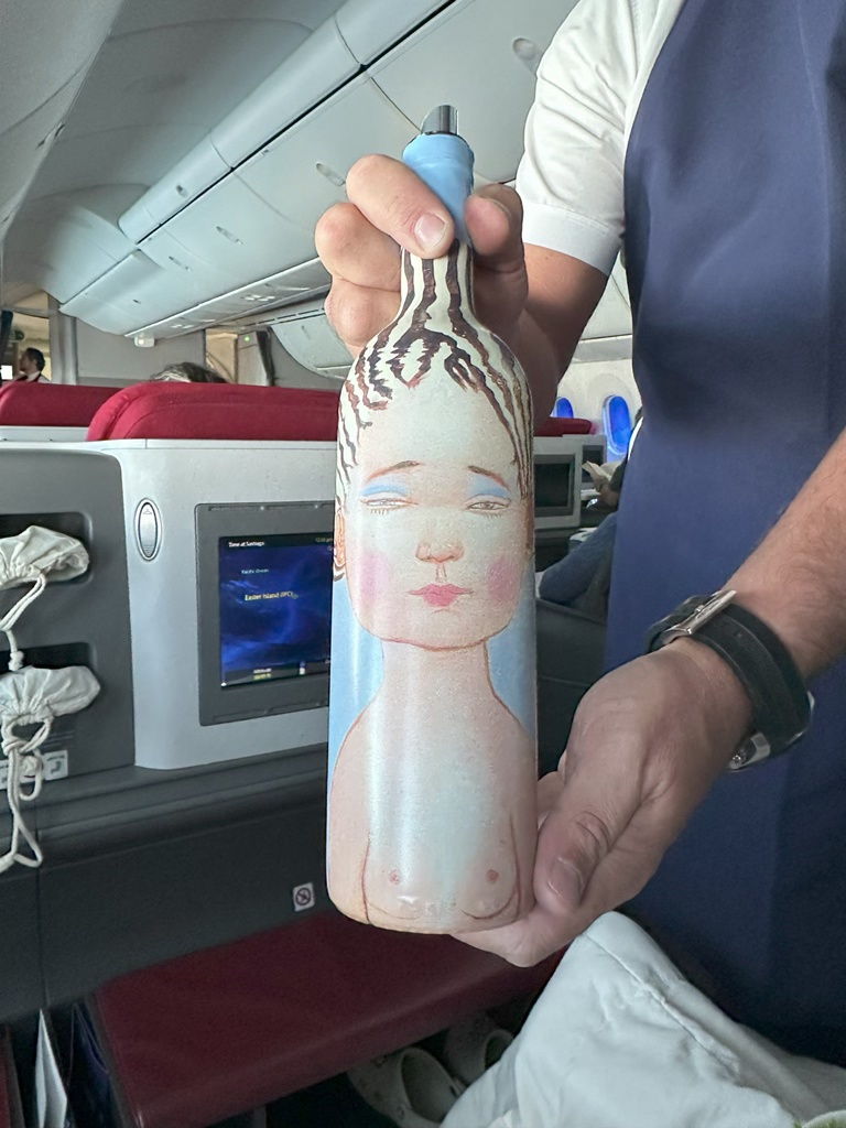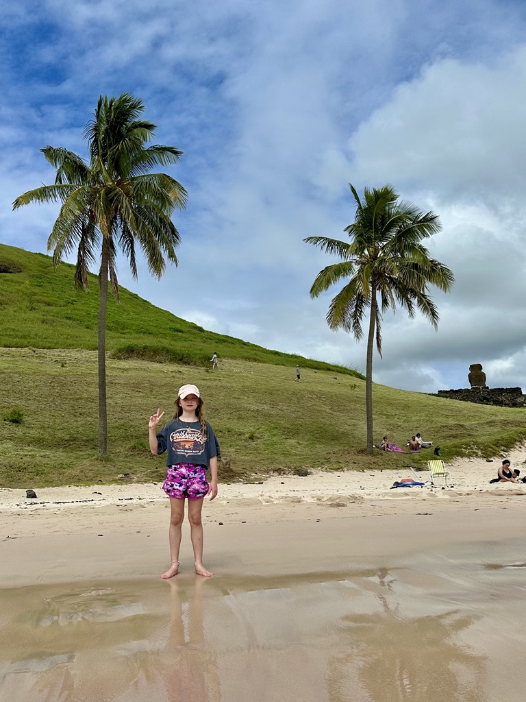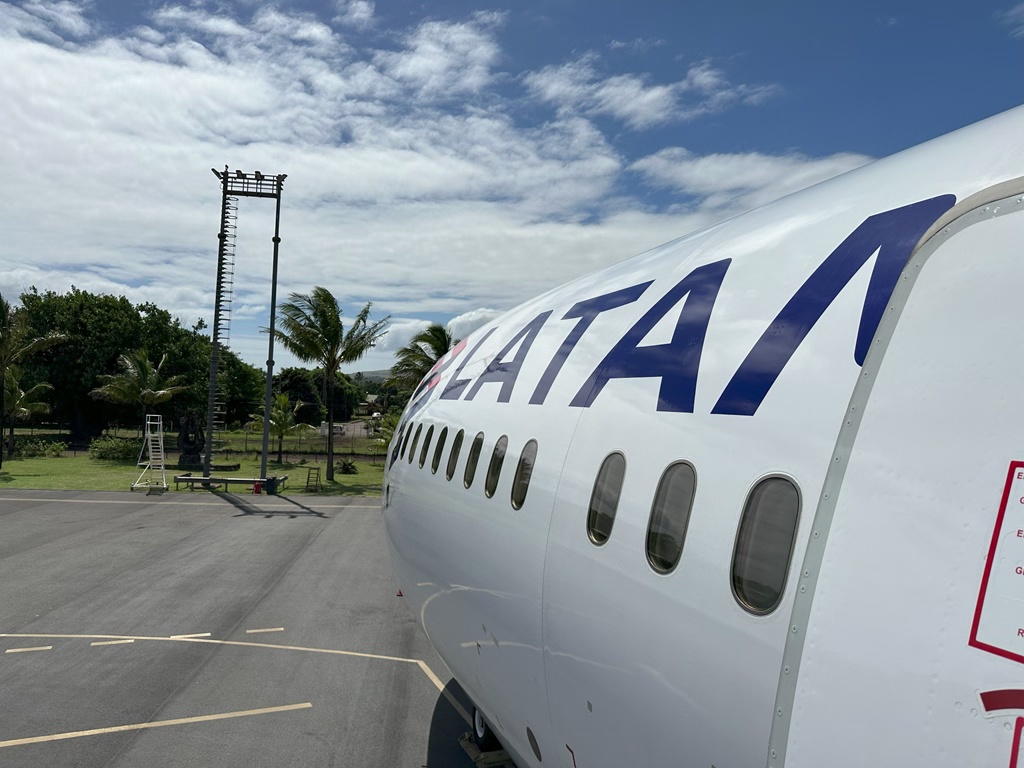 We had a restful night in Providencia and were once again back at the airport. I’d originally booked a flight at 9:10 am, so not too early, but the flight times were changed since then and we were bumped to an 8:15 flight. I never confirmed the change, and on certain days of the week, there are 2 daily flights to Rapa Nui. So last night I changed our flight time to the later one, at 10:35, so Ellie could sleep in a bit, and it was much appreciated. We arrived in plenty of time and went through the special document check for travelers to Rapa Nui (Easter Island, Isla de Pascua). You have to go through a similar process like border control, but not only is your passport checked, your accommodation booking and return flight booking are verified as well. It only took a few extra minutes because we were well prepared but I could see some people on the side scrambling last minute to find their documents and fill in the pre-departure form online.