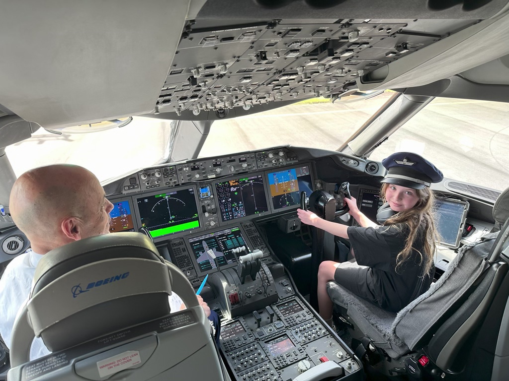 The captain invited Ellie to come to the cockpit for some photos on arrival as he was suitably impressed by her flight logbook. How many places are there going to be palm trees right outside the windshield of a Dreamliner!