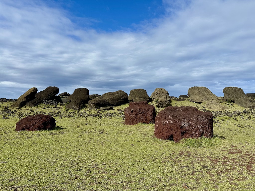 There are a bunch of moai still laying face down here. This platform (ahu) has not been restored and it is how it was found. There are pukao (the headdresses made from red volcanic rock) laying on the ground as well. These are remnants of the Huri Moai period around the year 1700 when Moai culture came to an end, with much internal fighting and toppling of the statues at various places.
