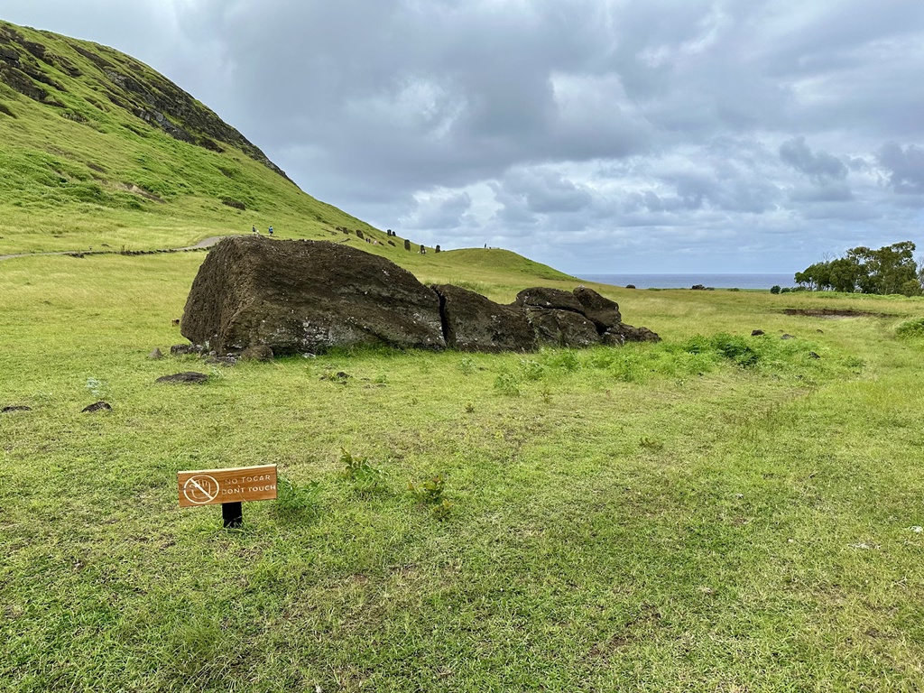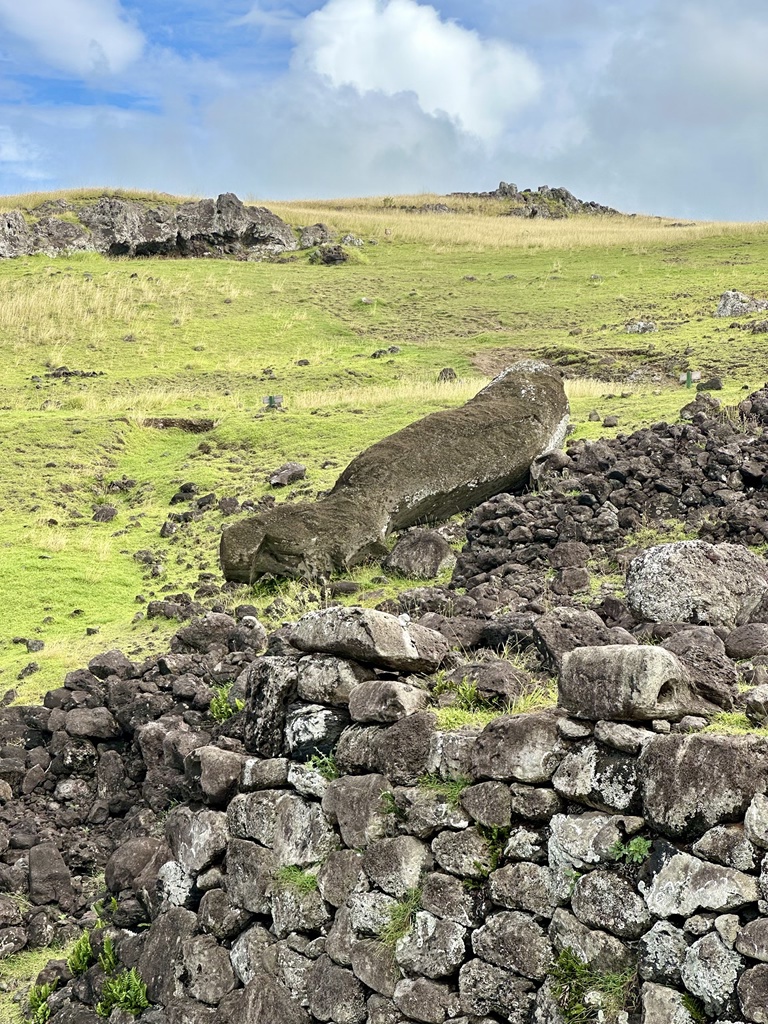 Moments after walking towards the hill, we saw a huge moai laying on its back for eternity.