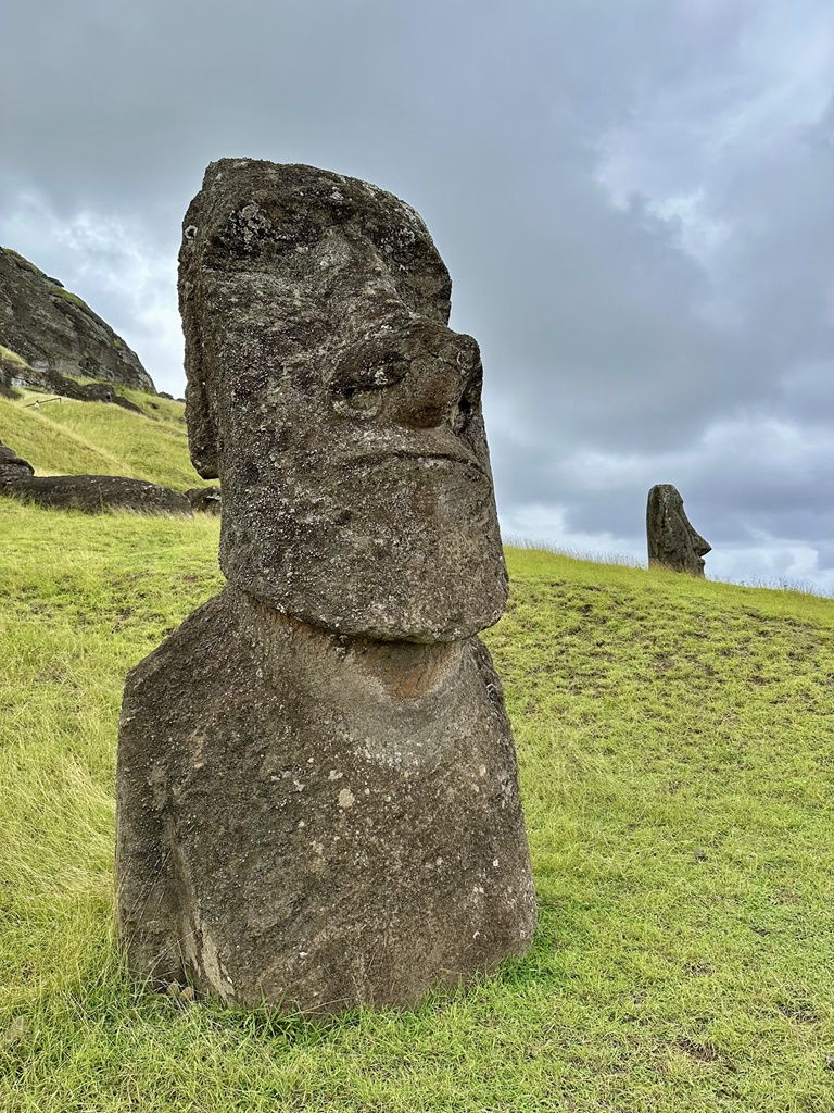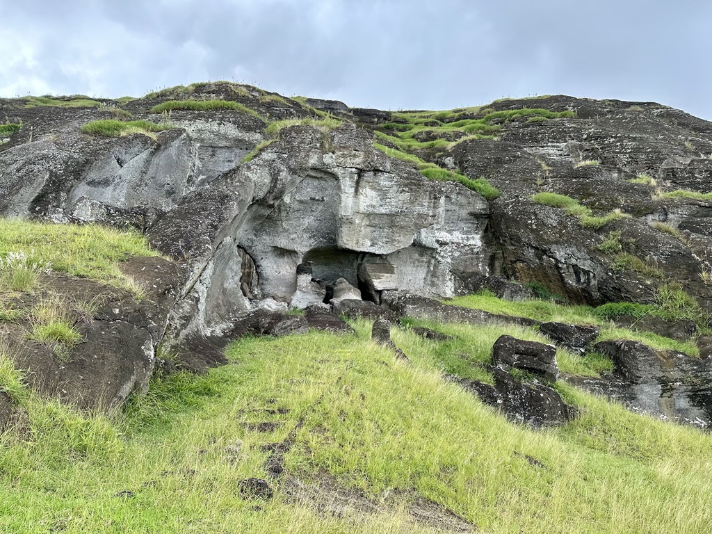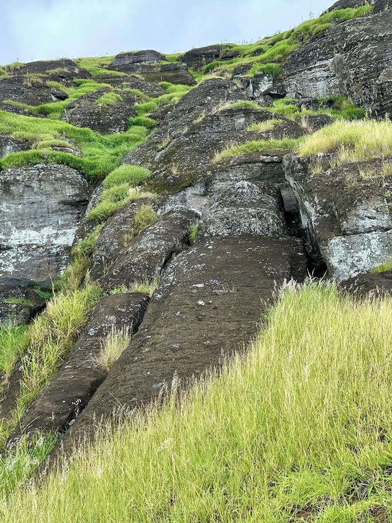 Here is another moai that was closer to completion. You can see how they started with the head and then moved on to the rest of the body. All of the moai were carved like this – on their backs, with the head done first. We can see now how small the head is compared to the body.