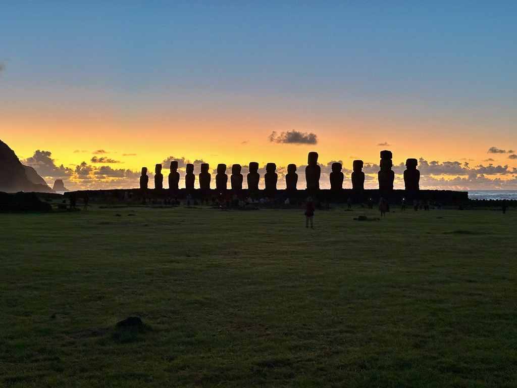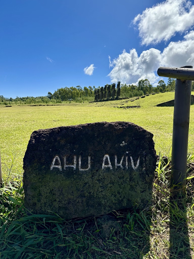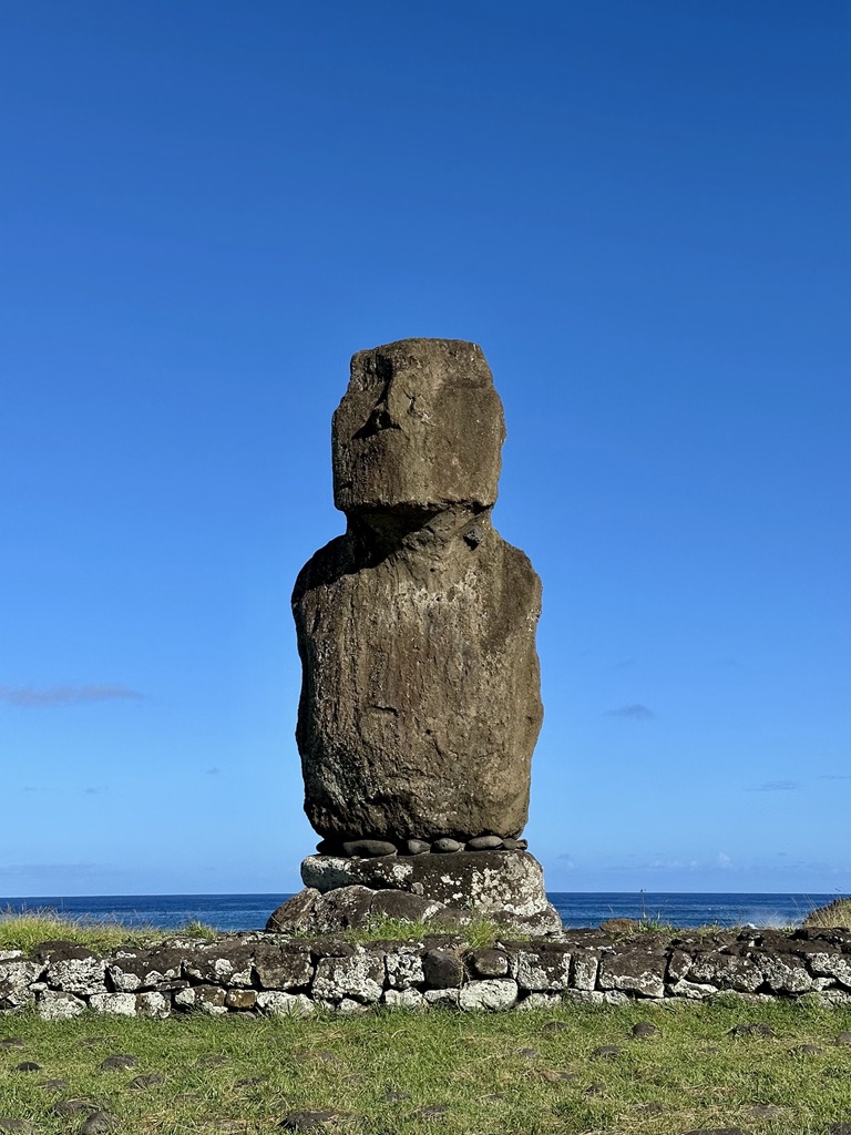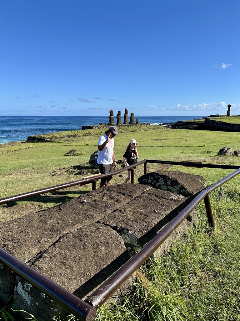 Next stop – Ahu Akivi. This is the only moai site on the island that had the moai facing towards the ocean, instead of inland. It’s unclear if this was intentional or whether they were simply aligned this way to watch over a village that just happened to be in the direction of the sea. As well, the statues exactly face sunset at the Spring Equinox and have their backs exactly to sunrise at Autumn Equinox. Here we’re more than 15 km from the quarry at Rano Raraku. Just imagine people having to bring these statues all the way over here without machinery.