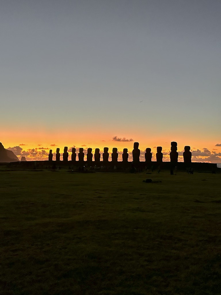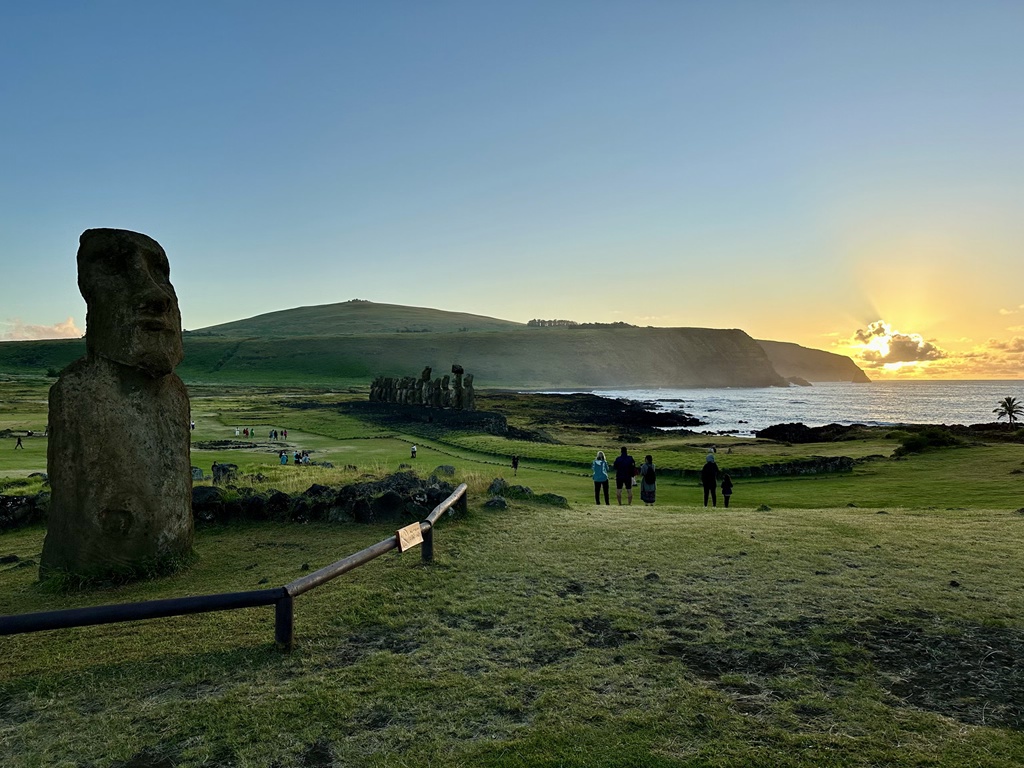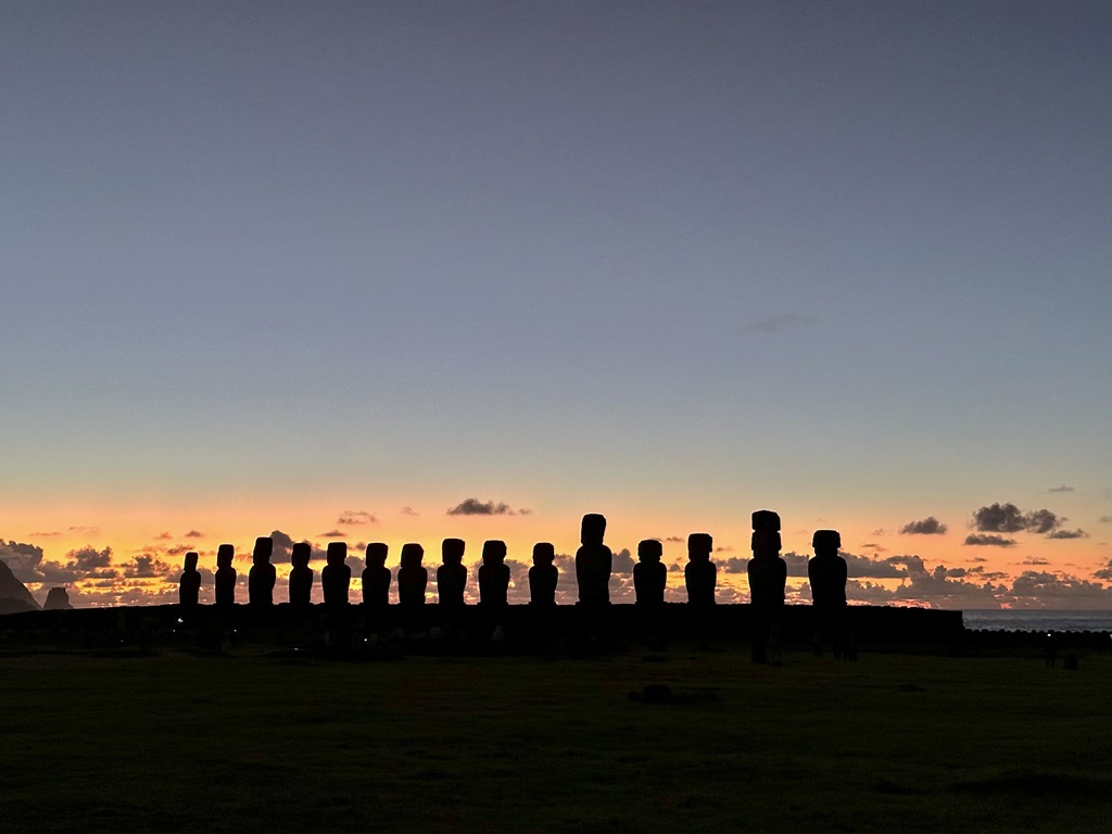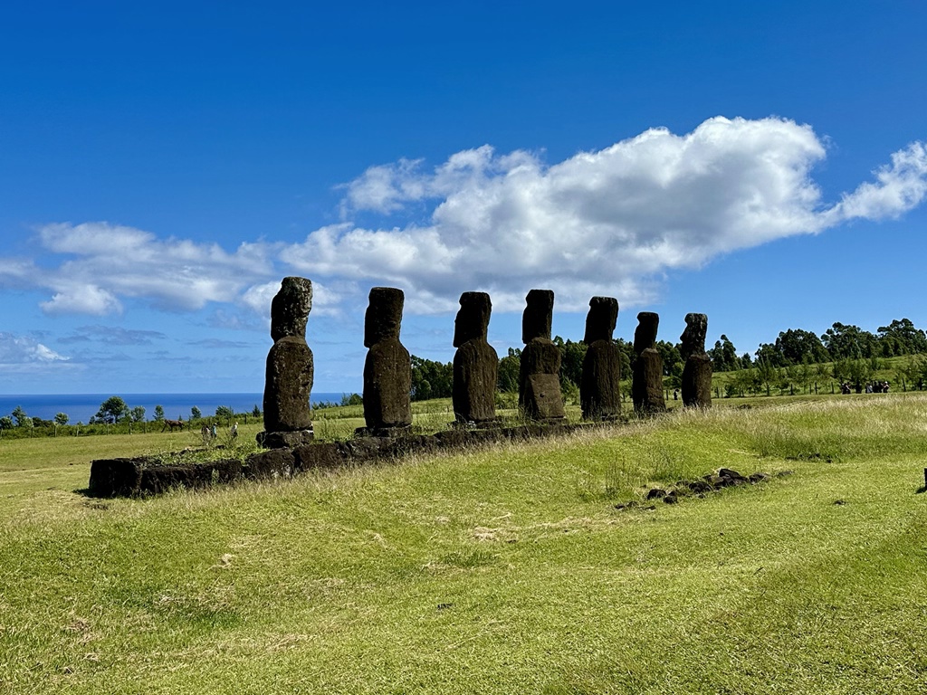 Next stop – Ahu Akivi. This is the only moai site on the island that had the moai facing towards the ocean, instead of inland. It’s unclear if this was intentional or whether they were simply aligned this way to watch over a village that just happened to be in the direction of the sea. As well, the statues exactly face sunset at the Spring Equinox and have their backs exactly to sunrise at Autumn Equinox. Here we’re more than 15 km from the quarry at Rano Raraku. Just imagine people having to bring these statues all the way over here without machinery.
