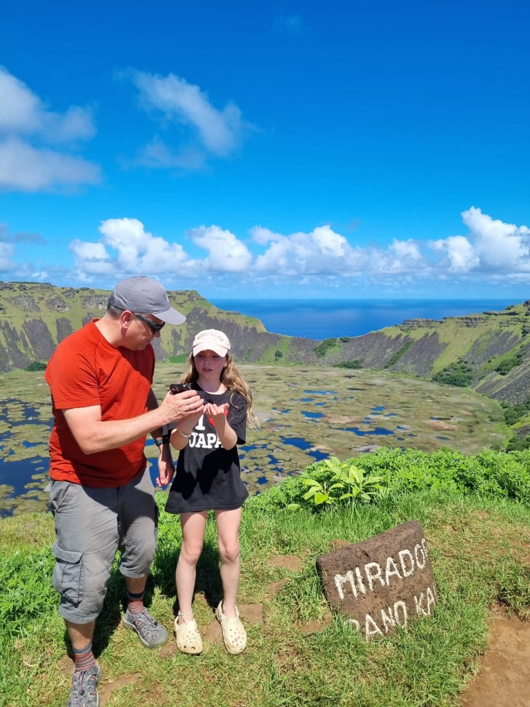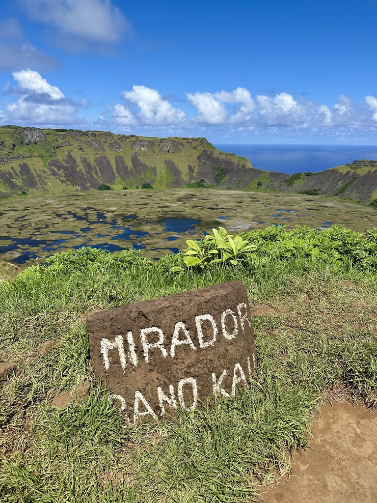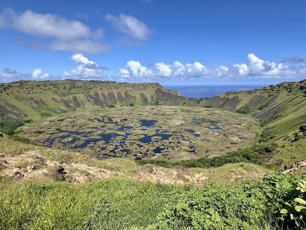 Up and up we go to Rano Kau, the stunning volcano on the southwest corner of the island. Remember how Rano means “volcano with a lake in the crater”? Well, this one was really quite interesting, as it wasn’t that deep and there were all sorts of patterns of reeds and other grasses growing in the very shallow sections.