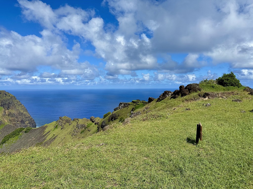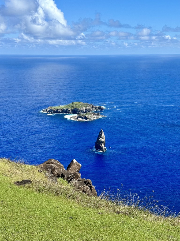 These rugged islands off the coast are named, from the closest to furthest, Motu Kao Kao, Motu Iti and Motu Nui (the large one) and had a very special meaning to the Rapa Nui people late in the period. It’s a story about the Birdman cult. During this period, the leaders was chosen not by decree, appointment, or bloodline, but by a special challenge. This happened every year and involved aspiring men to hike up to Orongo, stay in the houses, and then when the time was right, descend to the crater lake and retrieve reeds and wood for building bodysurfing type rafts. Next, they would climb down (hopefully without plummeting to their death) to the ocean shore, swim across the strait to the island on the raft, and find an egg from the manutara bird (a white tipped tern) who nests there annually. The first one to make it back up to Orongo with the egg was named tangata manu “birdman”, the representative of the God Make Make for the next year.