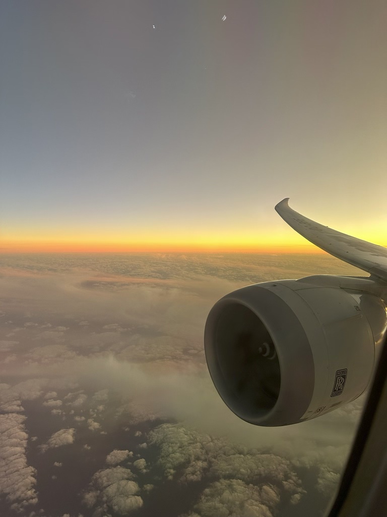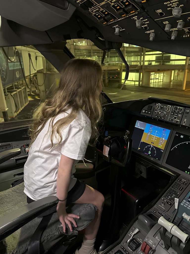 Another invitation from a friendly flight crew to visit the cockpit on arrival in Santiago. Ellie checks out the HUD on the Dreamliner. Like a real life video game!