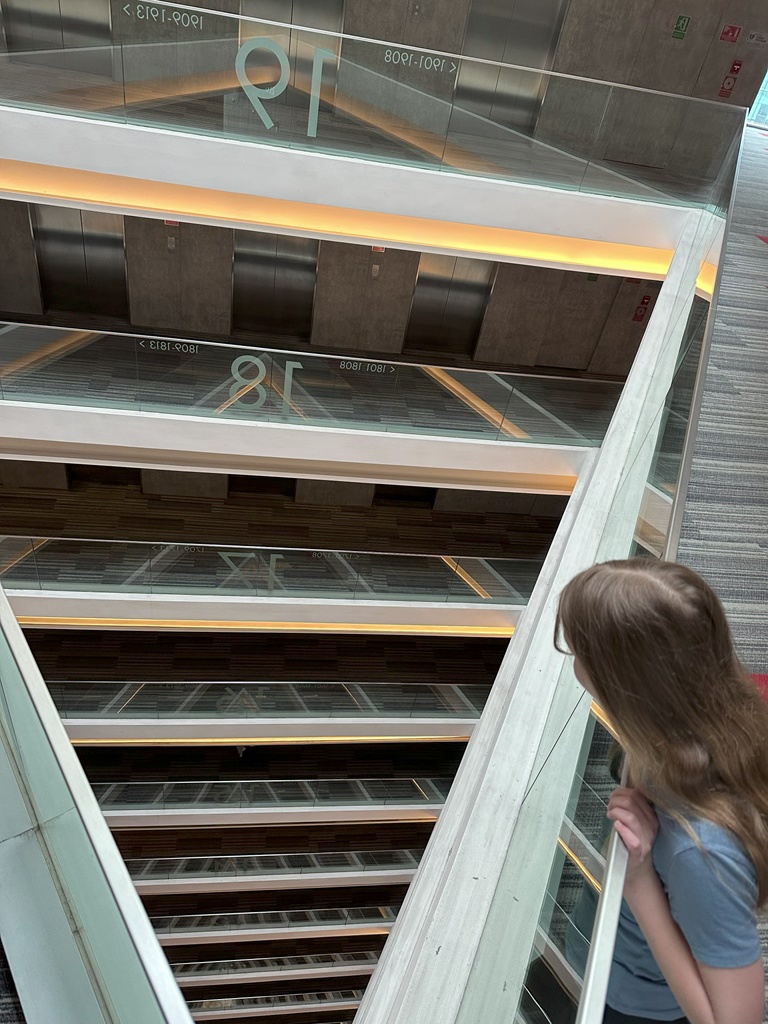 Ellie looked down the atrium to the lobby 19 floors below on our way down for breakfast.