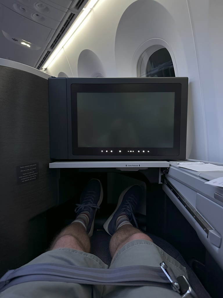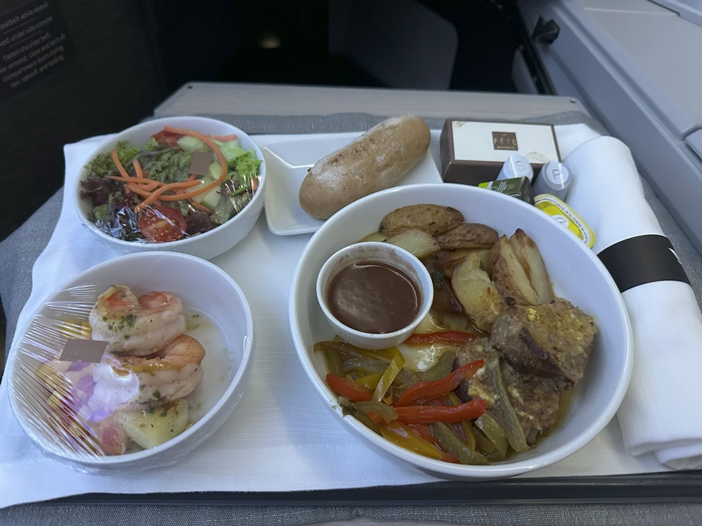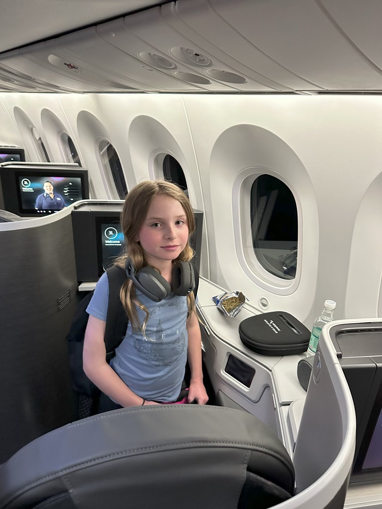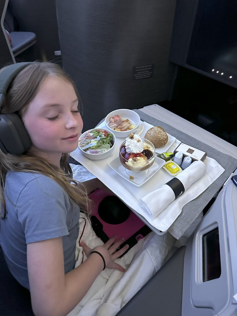They forgot to load Ellie’s kids meal so she got the starter tray and ice cream sundae before anyone else even got a drink to make up for it. Kudos to the cabin crew for that.