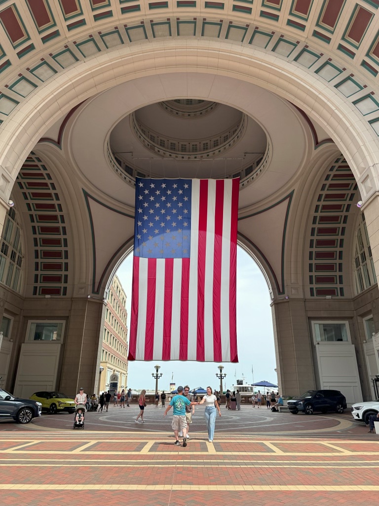 The Rowes Wharf building has a huge American flag hanging below its rotunda.