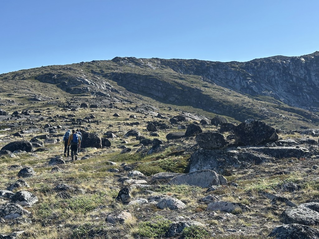 I took a picture of where we were hiking yesterday – the fjord in center left, and the lunch spot was in the rocky area beneath the wing.
