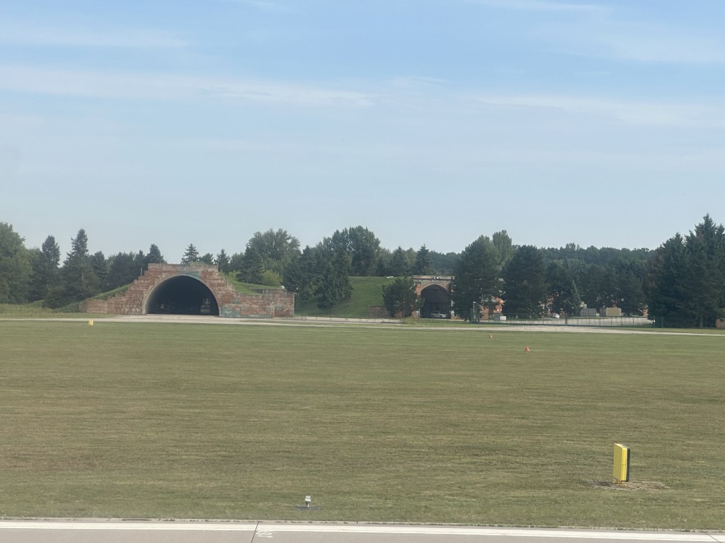 This airport is shared with the military, and on that side the hangars are covered with grass and trees for camouflage.