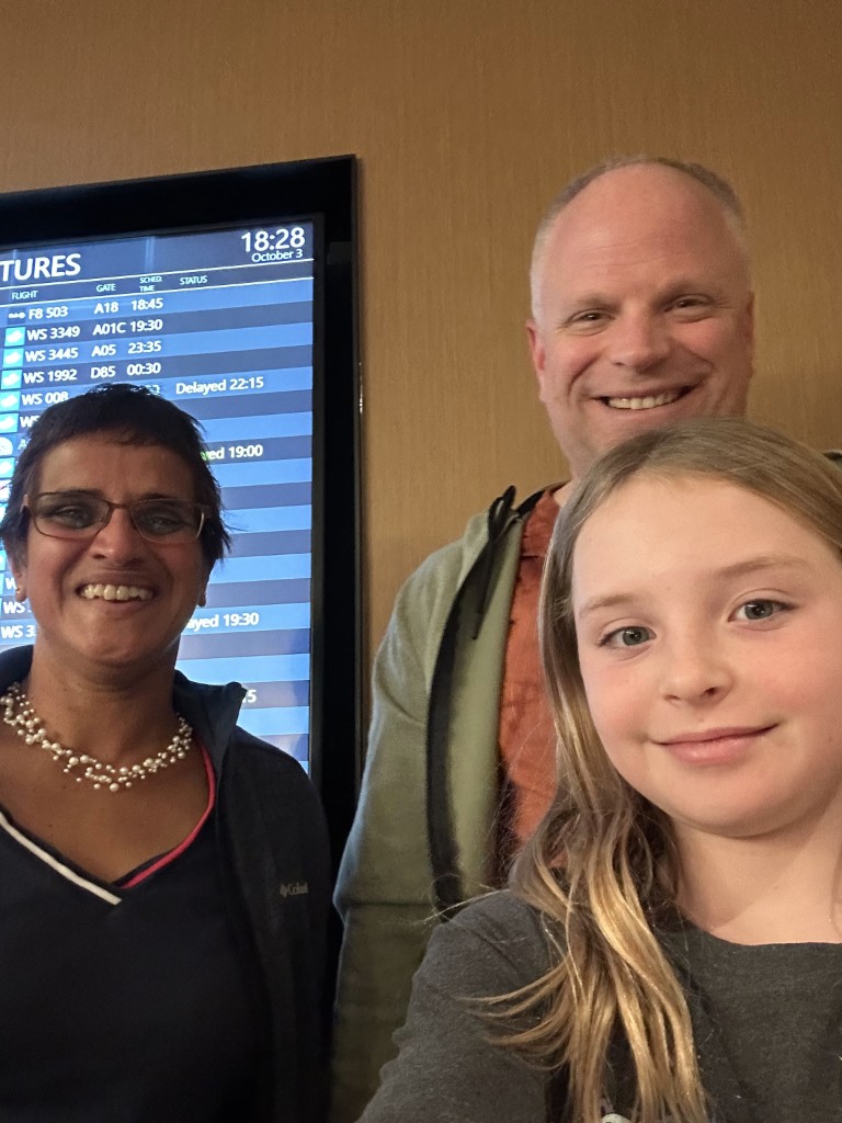We arrived early to have a bite at the WestJet Elevation Lounge – which was totally packed, a bigger line than I’d ever seen before. Thankfully we got to cruise on by…but not before spotting our old friend, Sneha, who still had to wait in line for a bit but caught up to us in the lounge. What a nice coincidence!