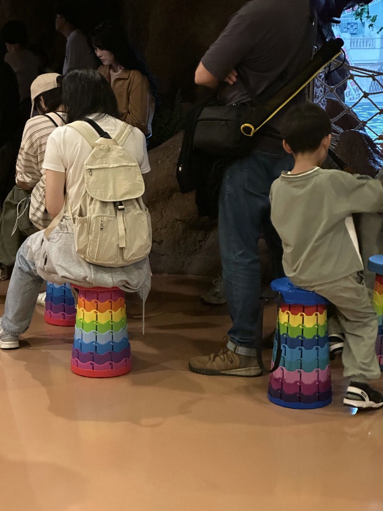 The lines became insanely long later in the afternoon – guess no one’s staying home on this rainy day – and some of the rides had wait times posted of 3-4 hours. Looks like Koreans are used to this though, as there were a ton of people with these collapsible seats for waiting in lines.