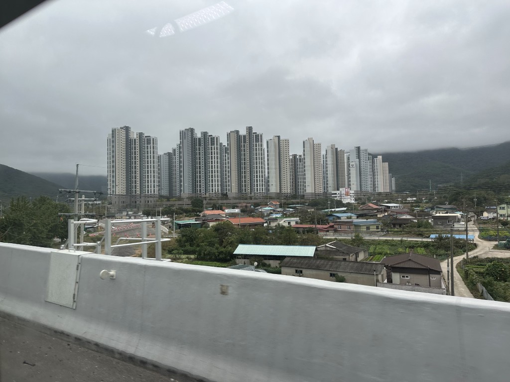 Our final morning in Gyeongju was gloomy, but that was OK. Here’s a look at a newer suburban part of Gyeongju by the railway station. So many of the cities that we passed through on the train contained these dense forests of 30-50 floor apartment towers.