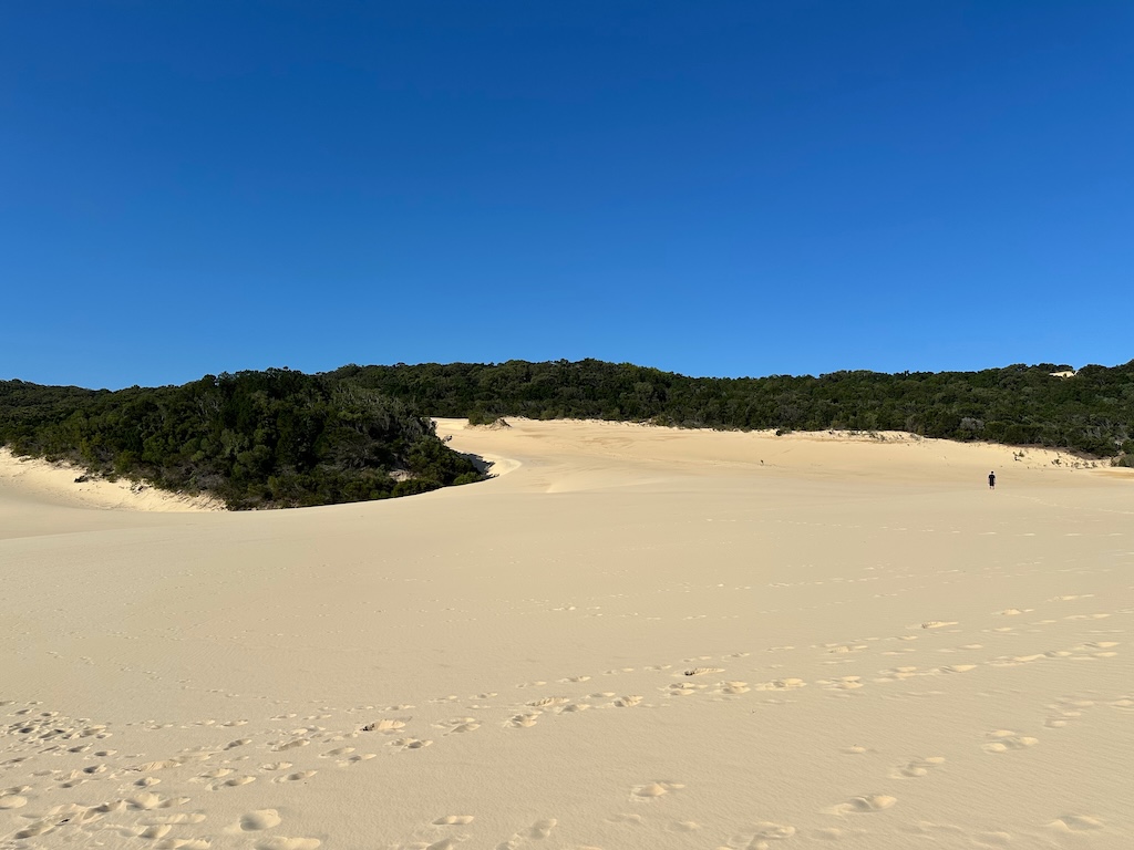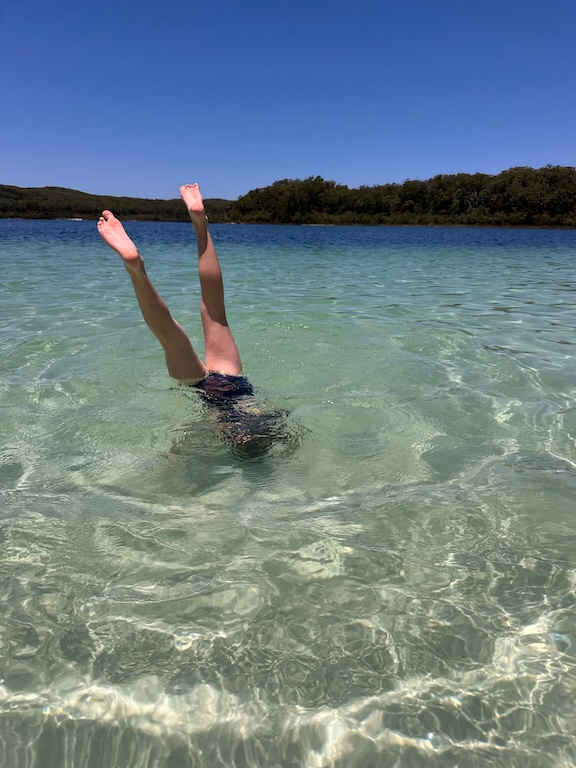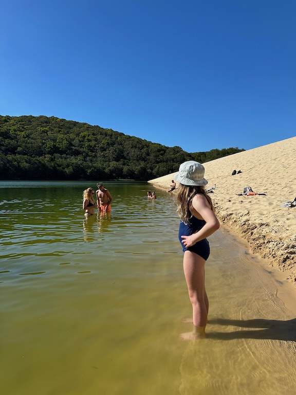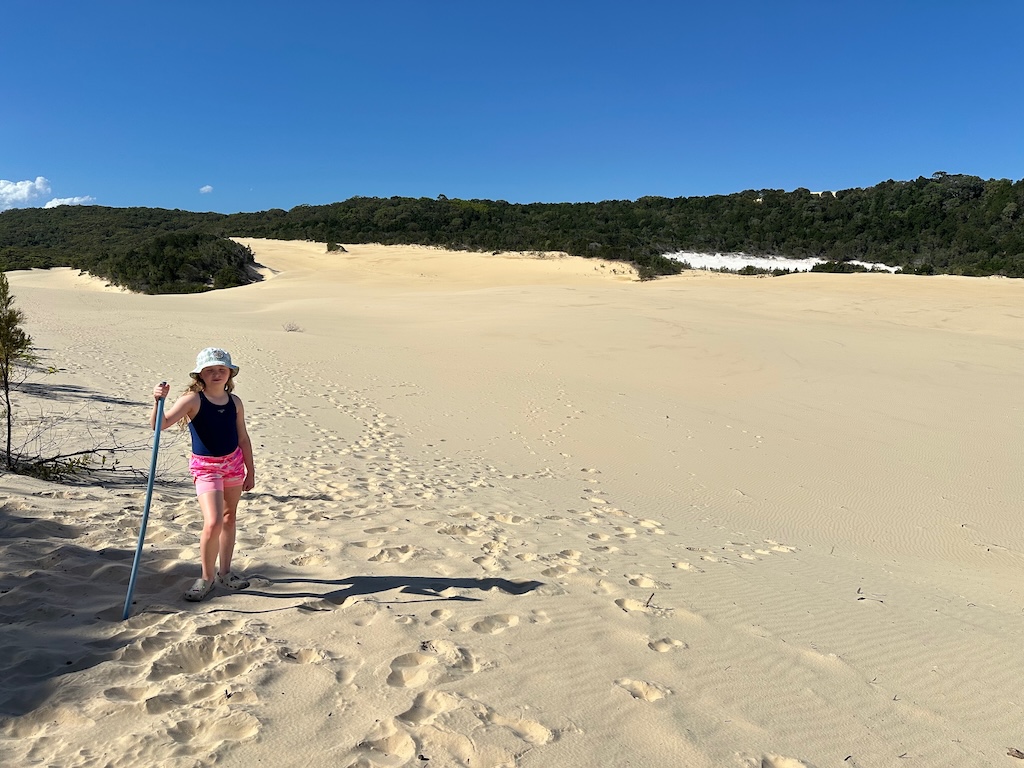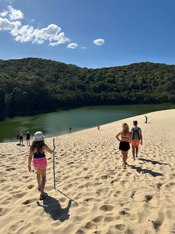 The afternoon’s outing was a hike to Lake Wabby. Another lake inland in the dunes, just below a sea of sand to the left behind Ellie, proudly holding her dingo stick. No, it’s not a hiking pole! That’s to scare dingos away/whack them!