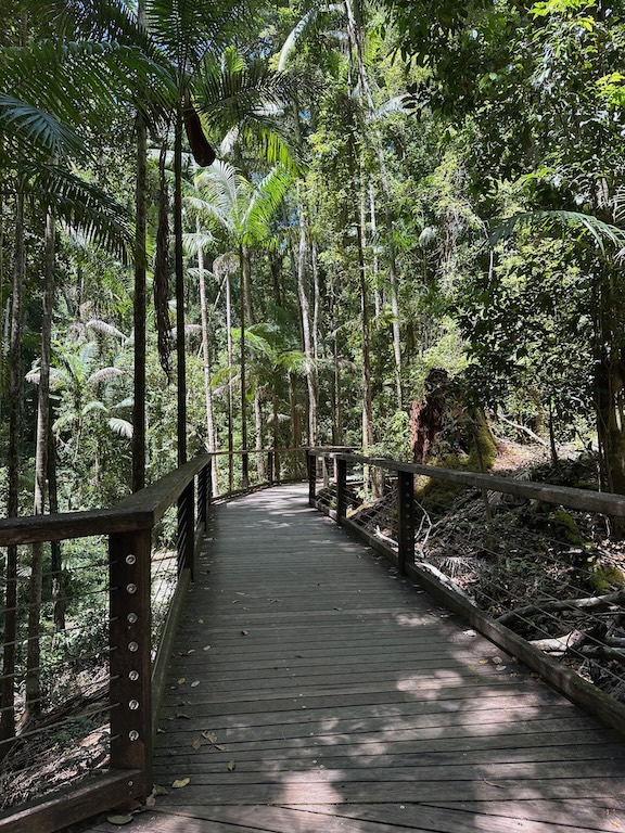 The dry, mixed forest we’d driven through near Lake McKenzie gave way to a lush, moist environment with tall trees, ferns, and palms.
